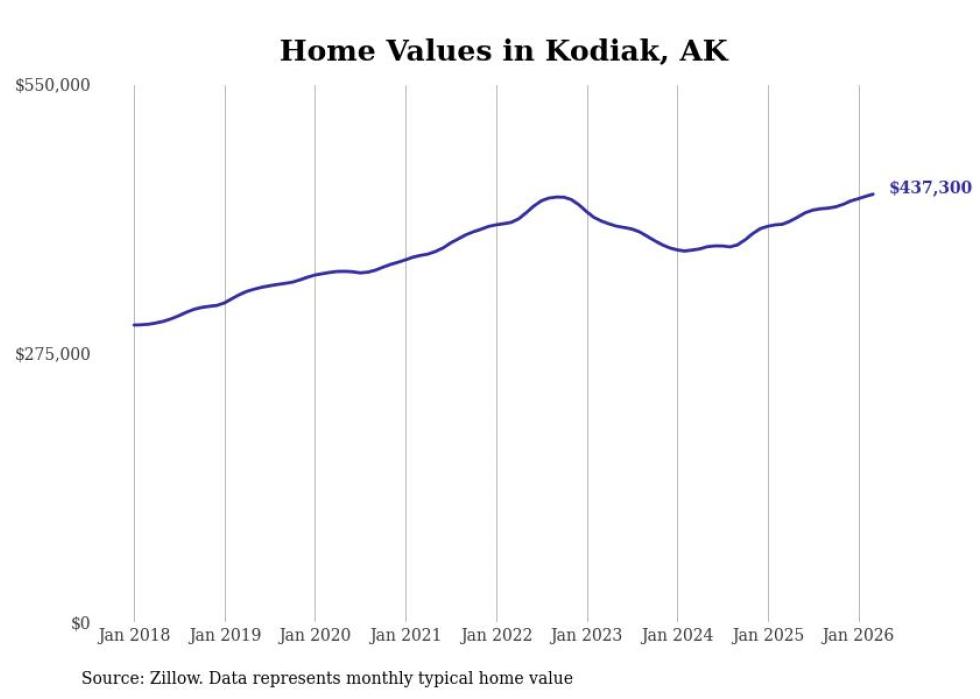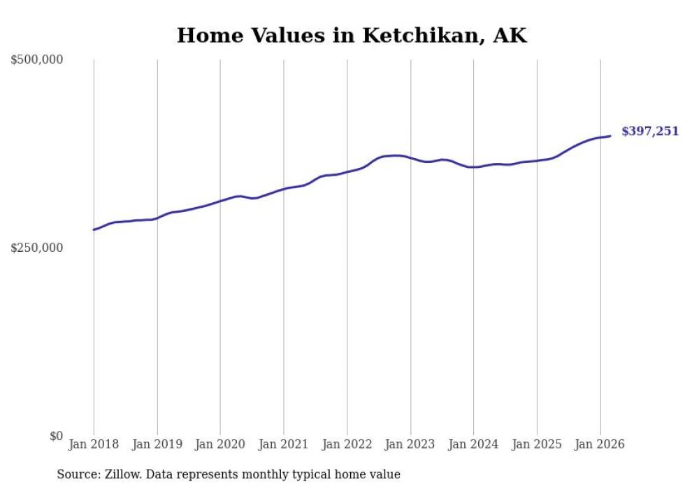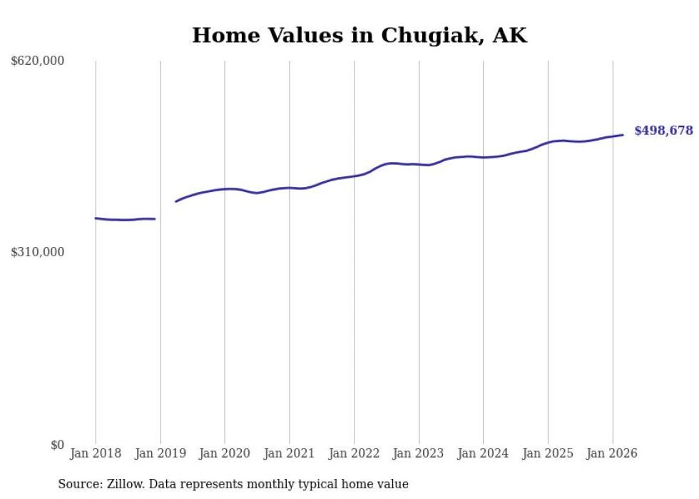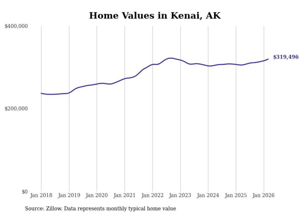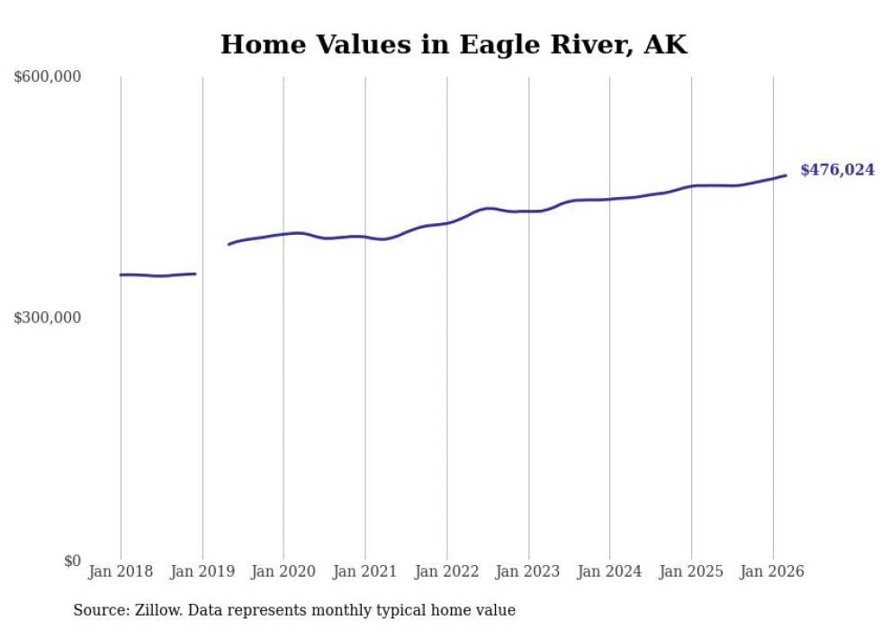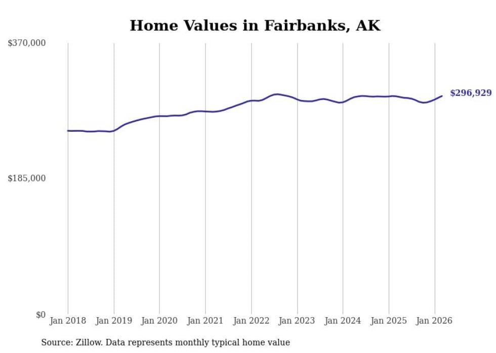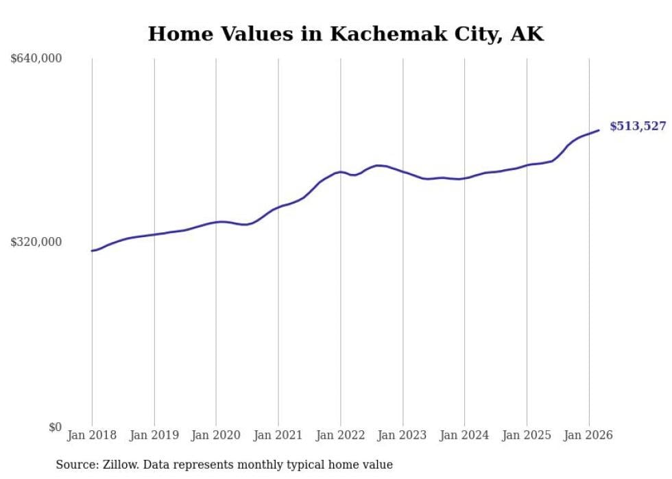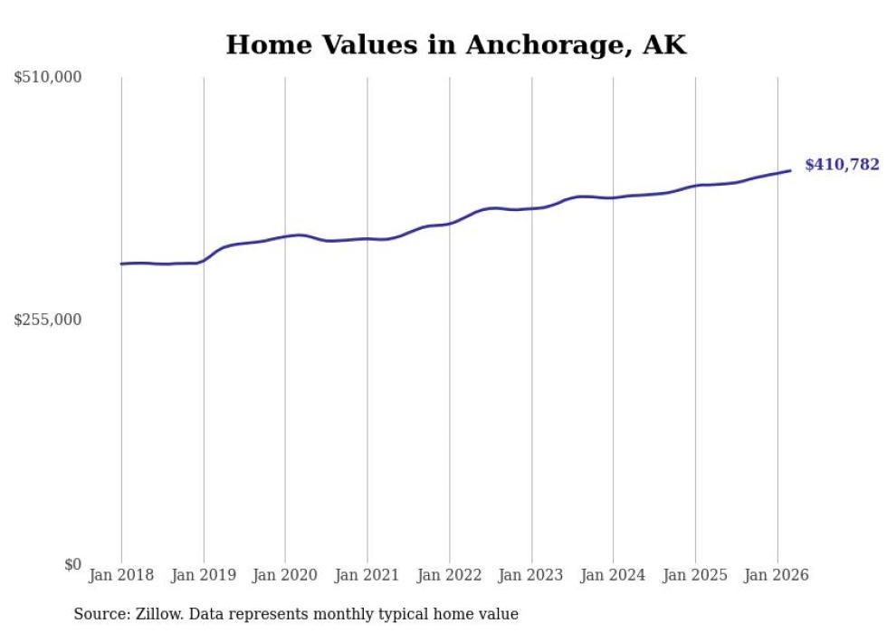 compiled a list of cities with the fastest-growing home prices in Alaska using data from . Cities are ranked by the dollar change in the Zillow Home Values Index for all homes from the 12 months ending March 2026. The charts in this story were created automatically using . Data was available for 40 cities and towns in Alaska.