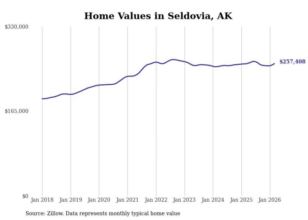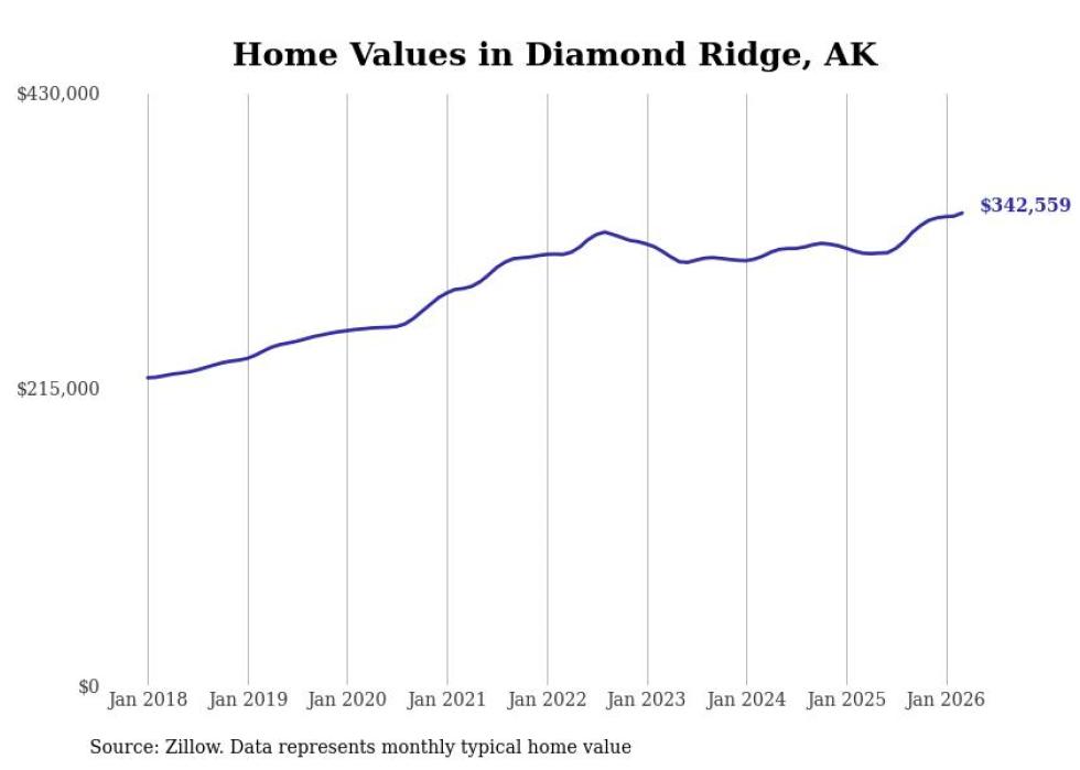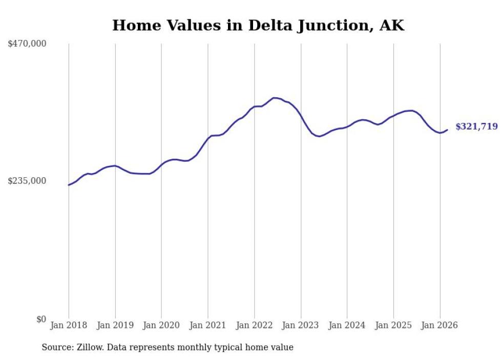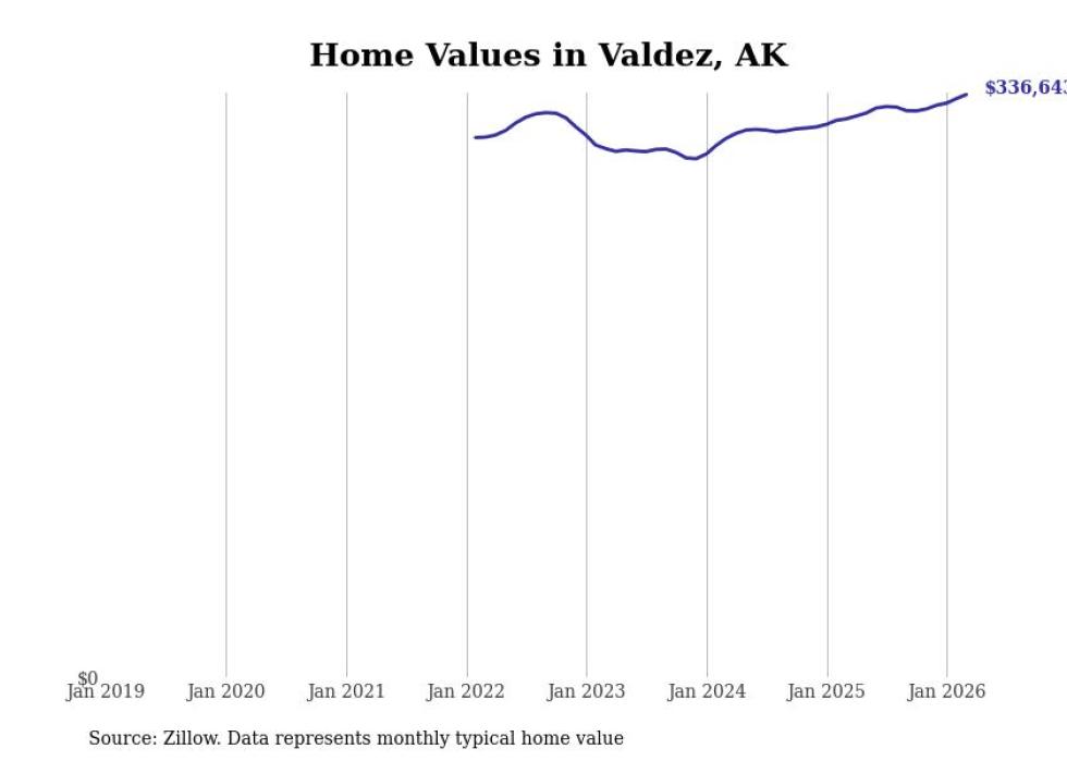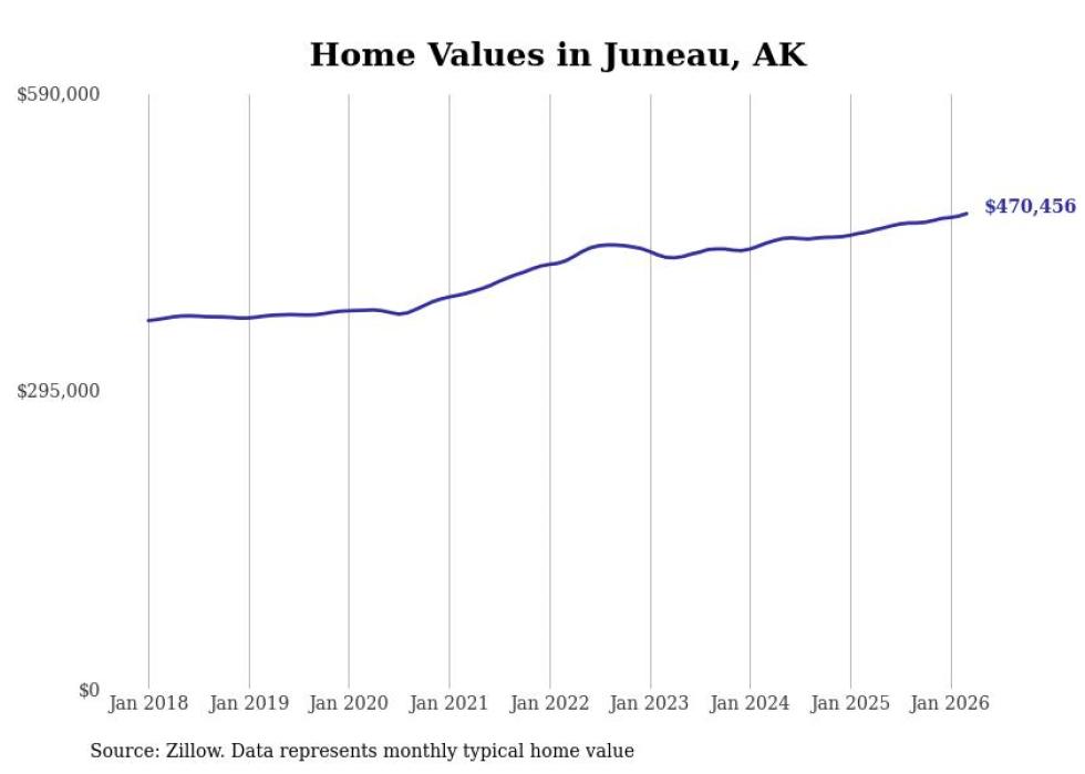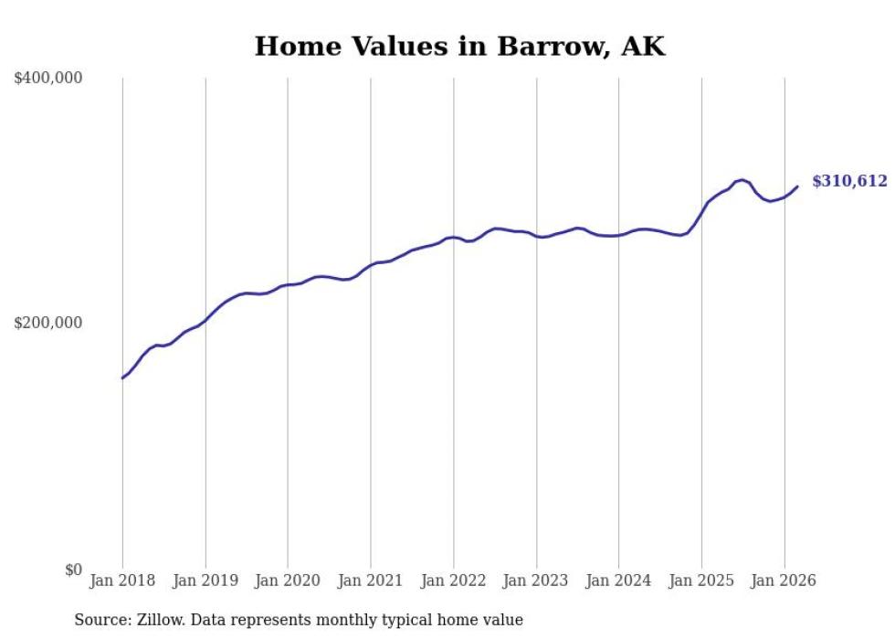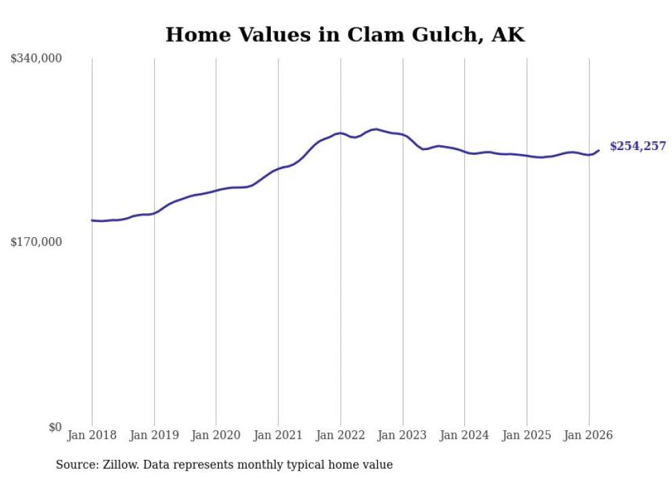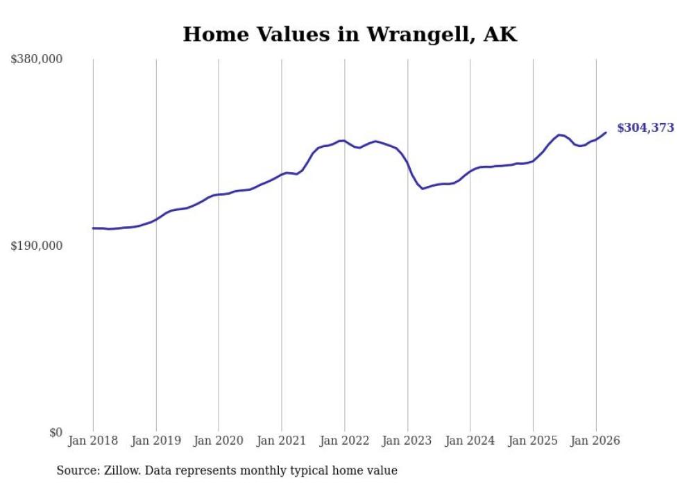 compiled a list of cities with the fastest-growing home prices in Alaska using data from . Cities are ranked by the dollar change in the Zillow Home Values Index for all homes from the 12 months ending March 2026. The charts in this story were created automatically using . Data was available for 40 cities and towns in Alaska.