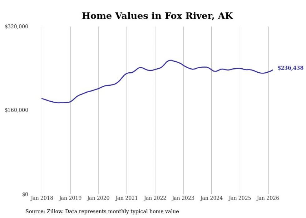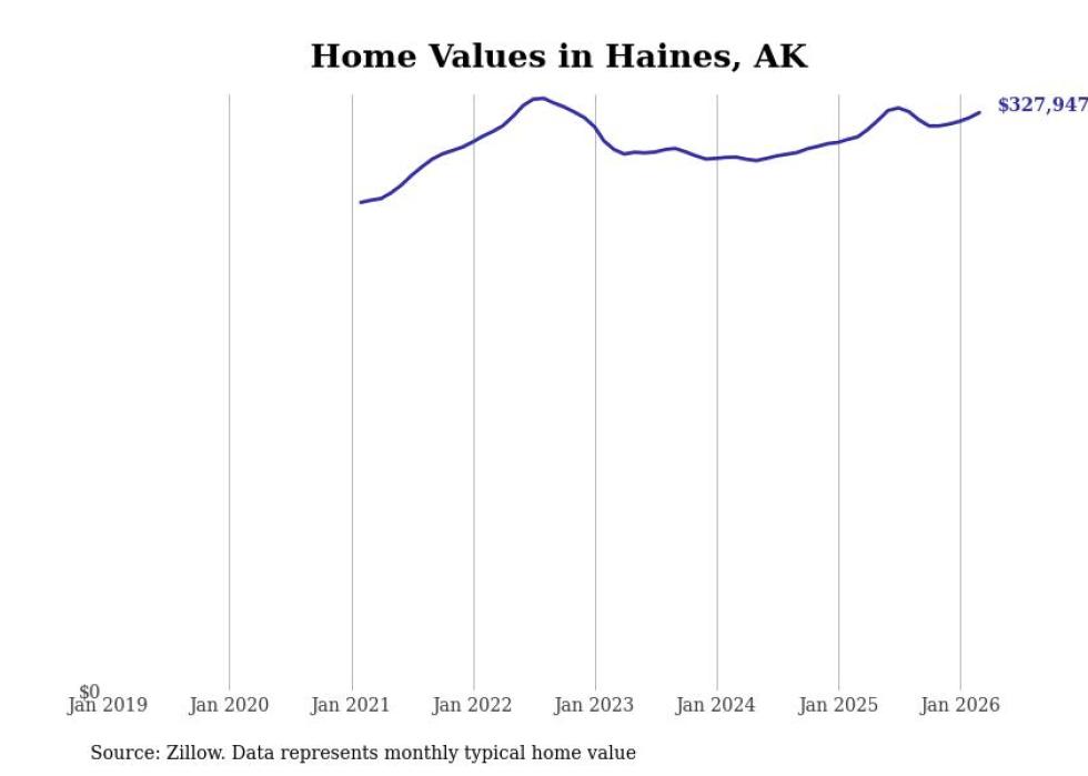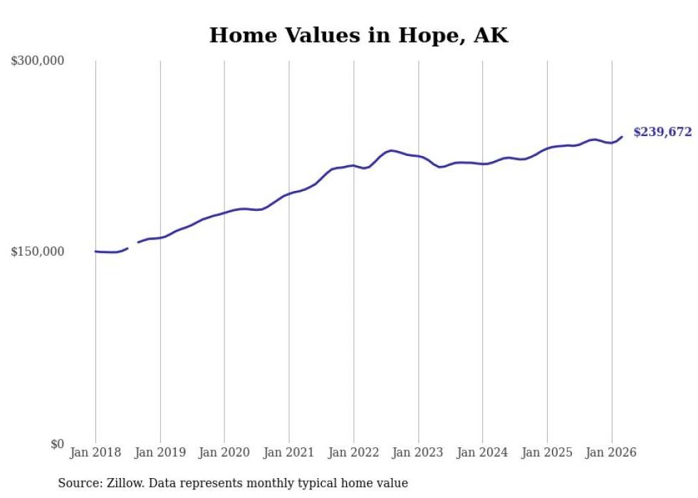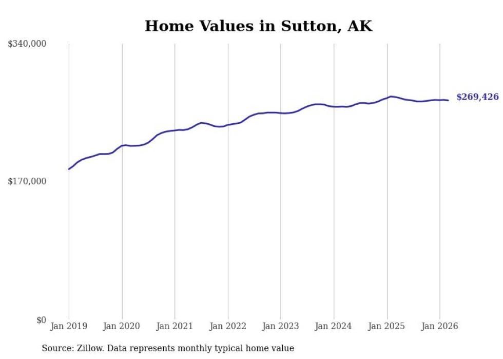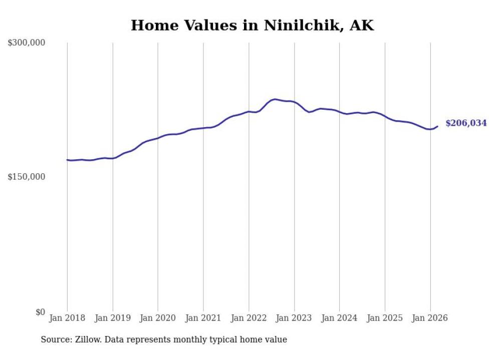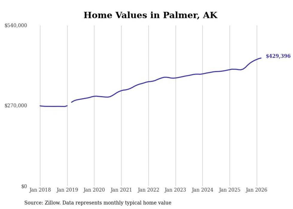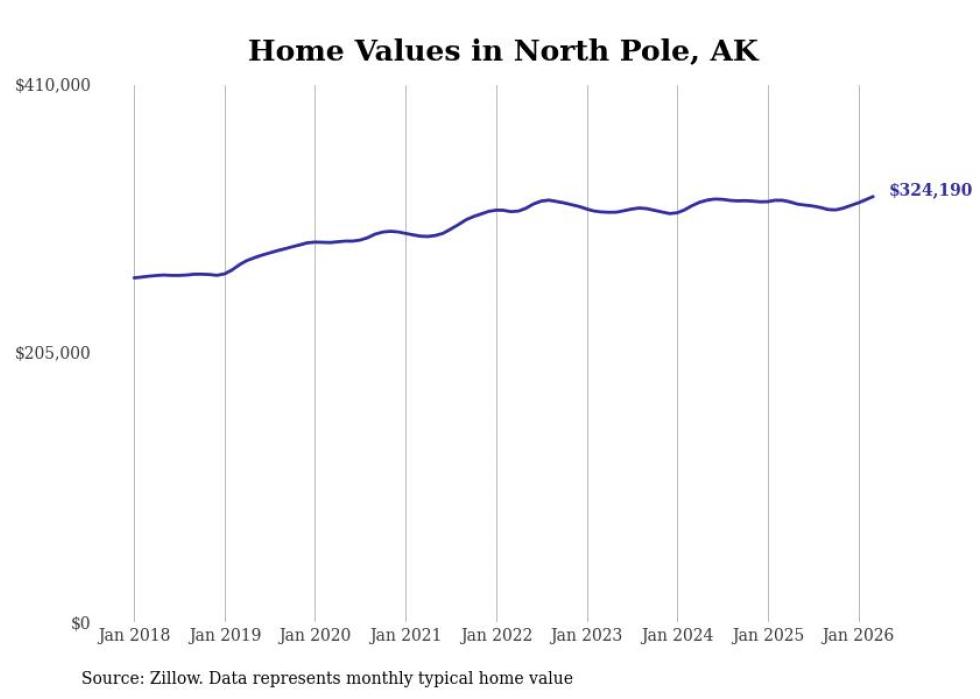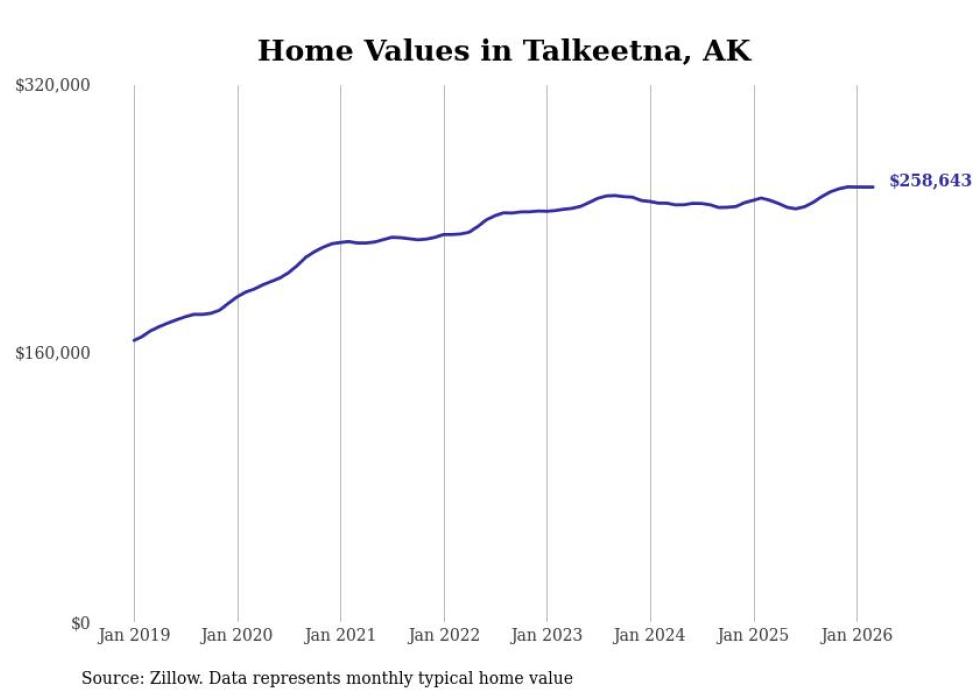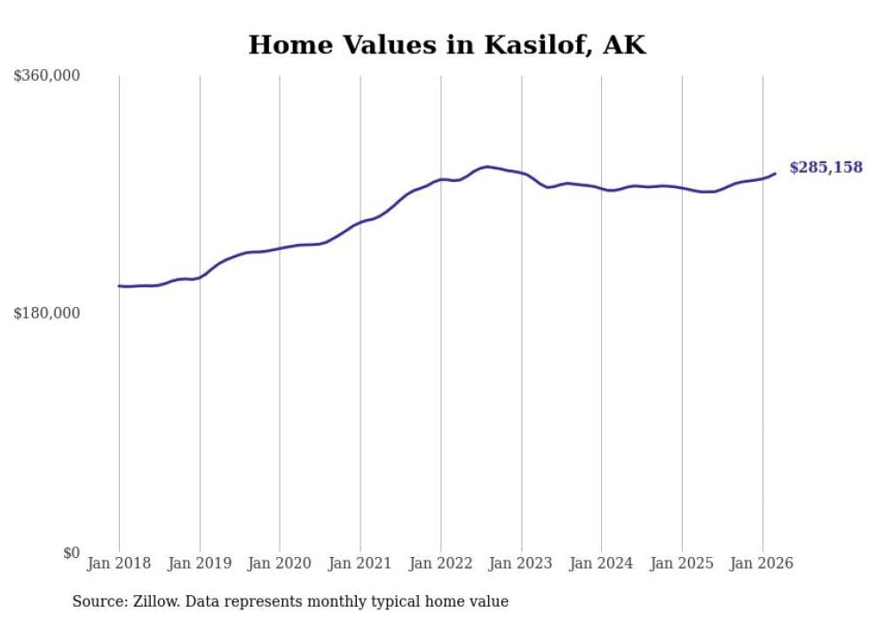 compiled a list of cities with the fastest-growing home prices in Alaska using data from . Cities are ranked by the dollar change in the Zillow Home Values Index for all homes from the 12 months ending March 2026. The charts in this story were created automatically using . Data was available for 40 cities and towns in Alaska.