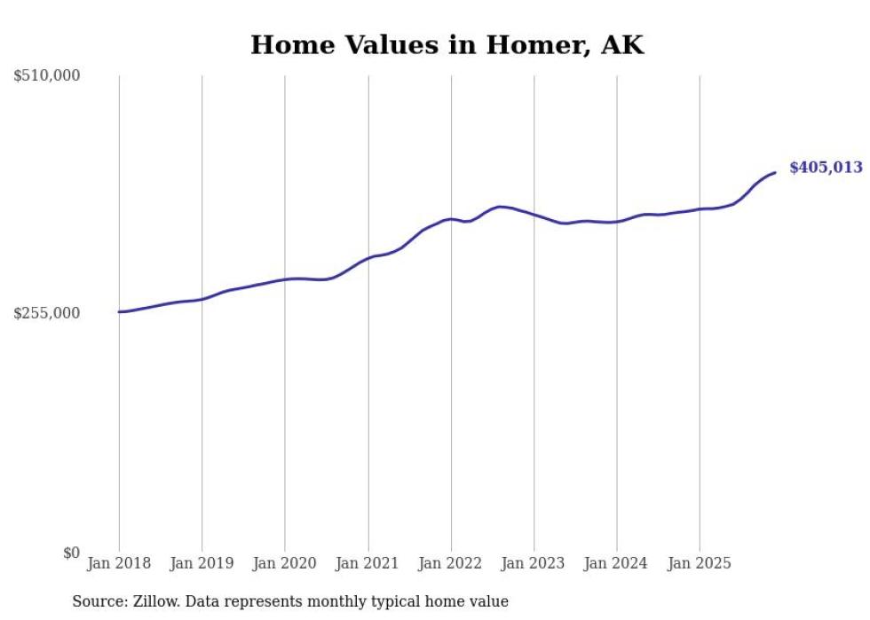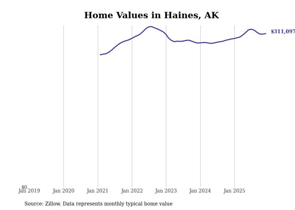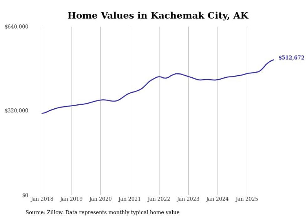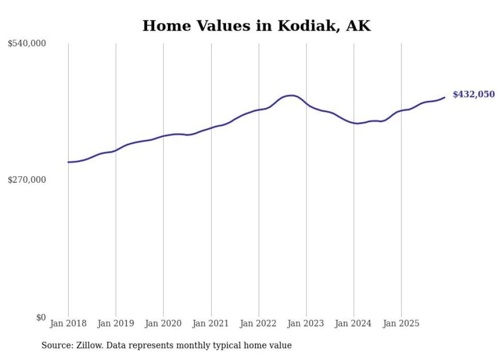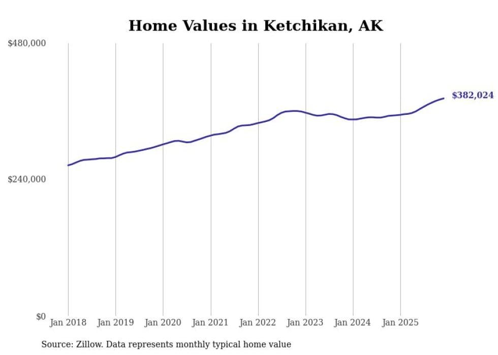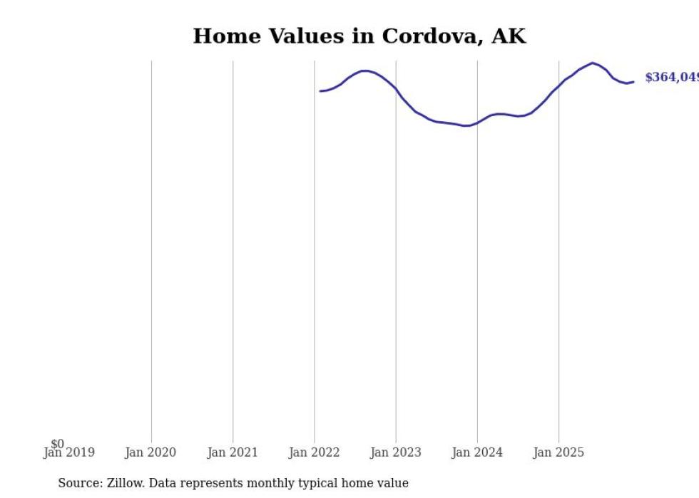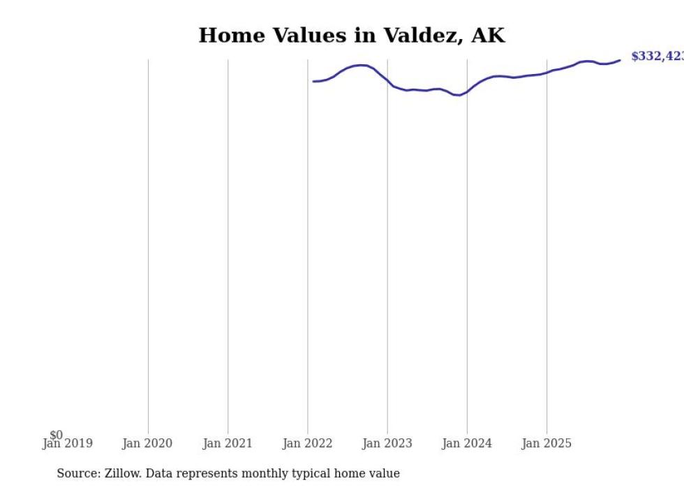 compiled a list of cities with the most expensive homes in Alaska using data from . Cities are ranked by the Zillow Home Values Index for all homes as of December 2025. The charts in this story were created automatically using .