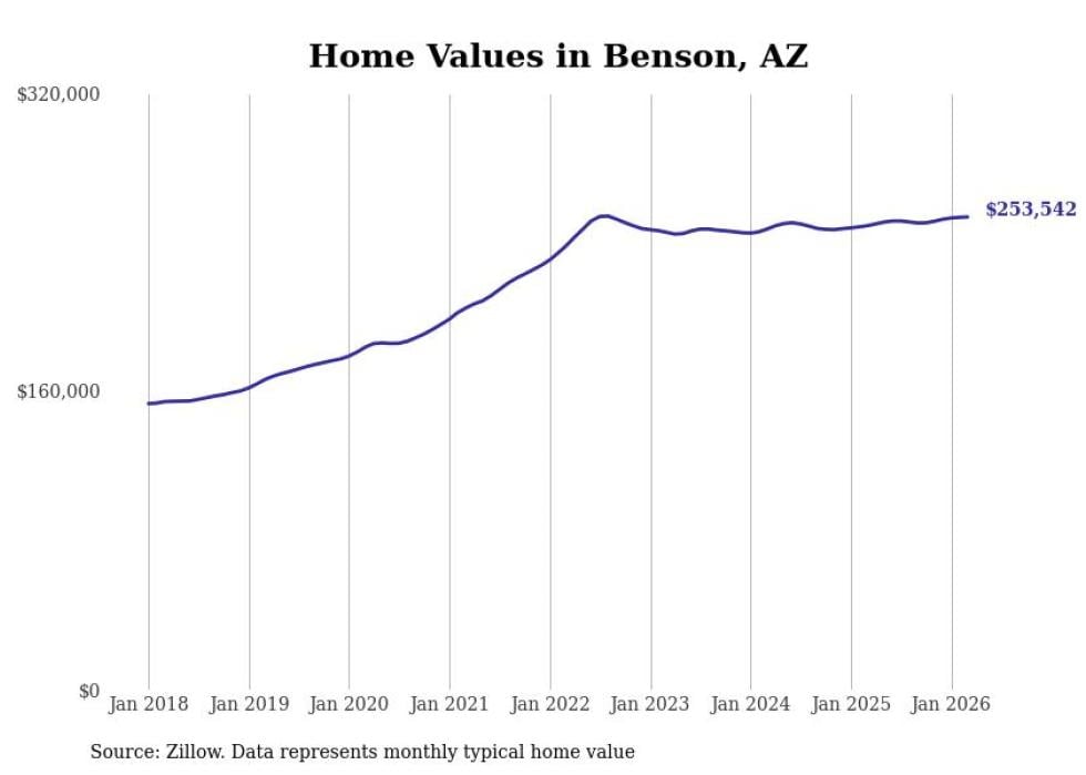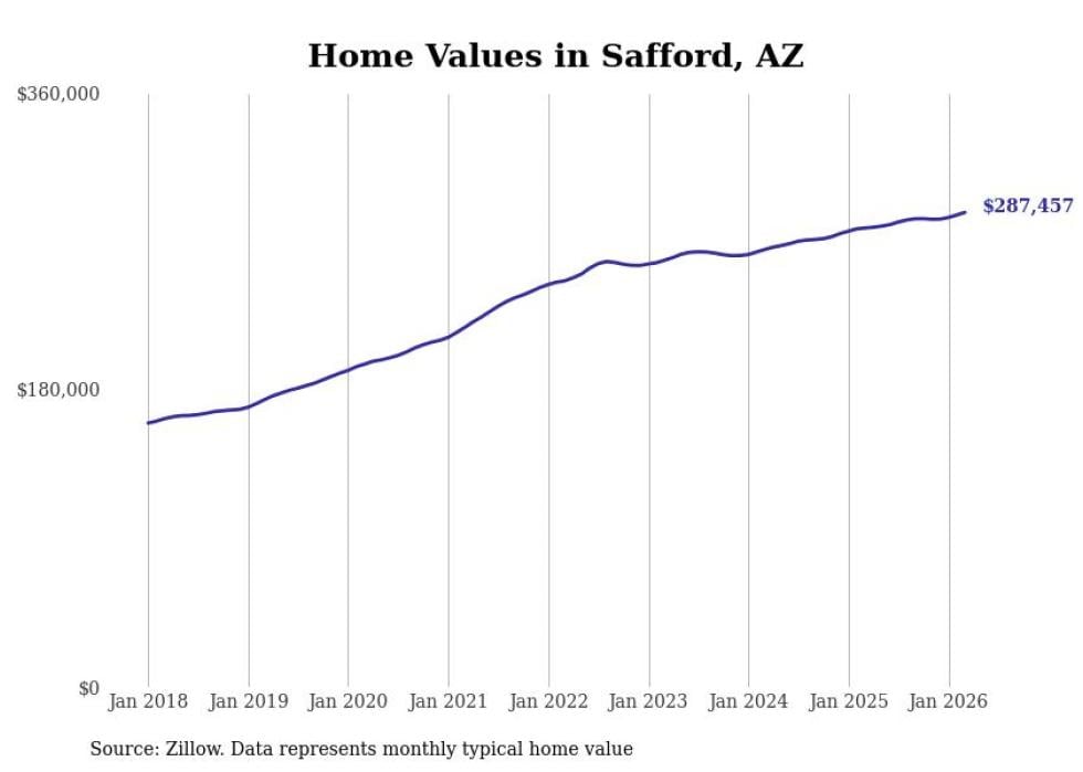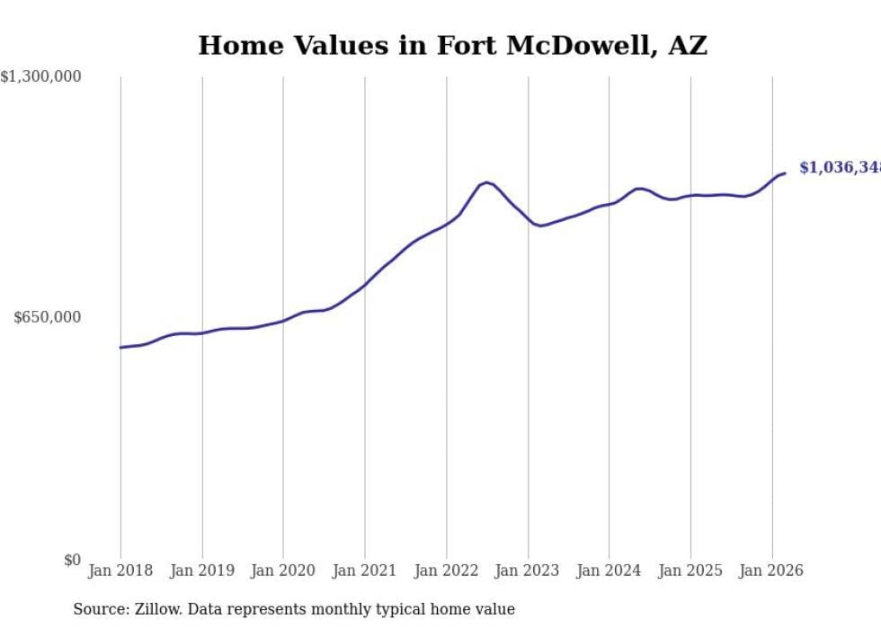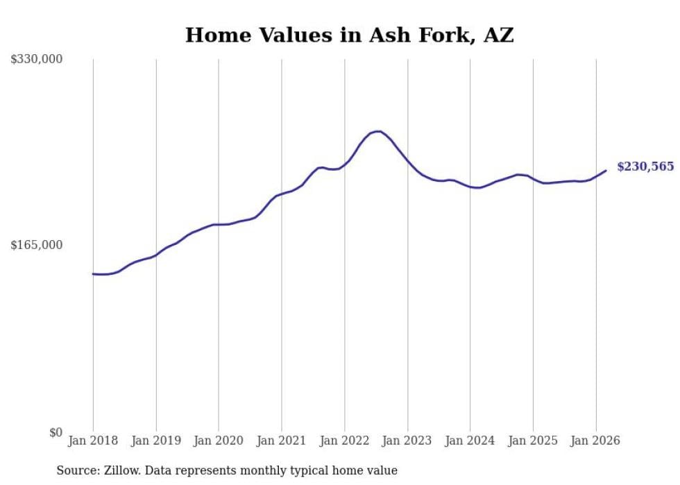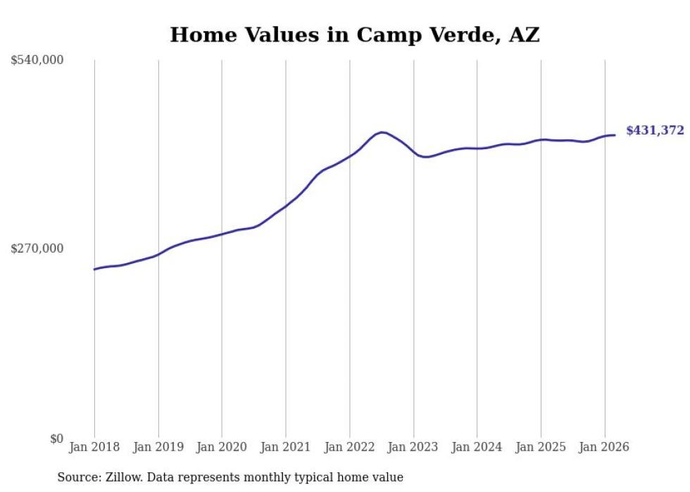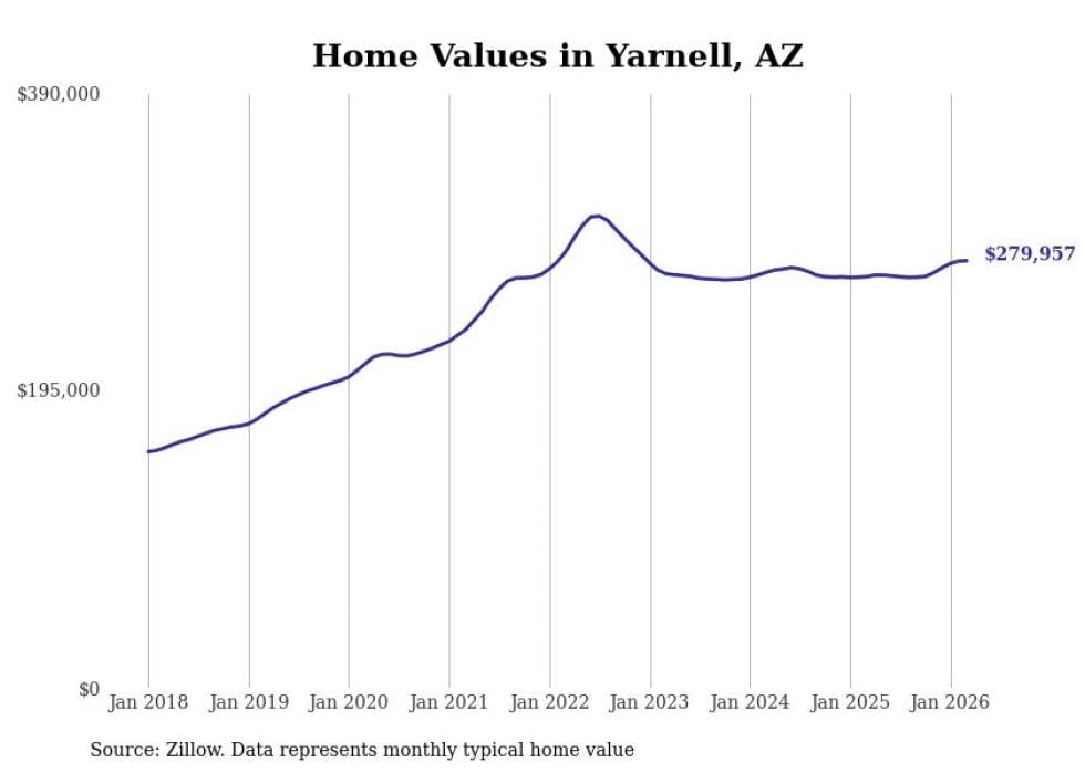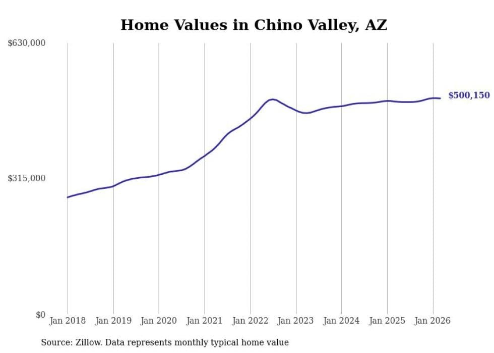 compiled a list of cities with the fastest-growing home prices in Arizona using data from . Cities are ranked by the dollar change in the Zillow Home Values Index for all homes from the 12 months ending March 2026. The charts in this story were created automatically using . Data was available for 50 cities and towns in Arizona.