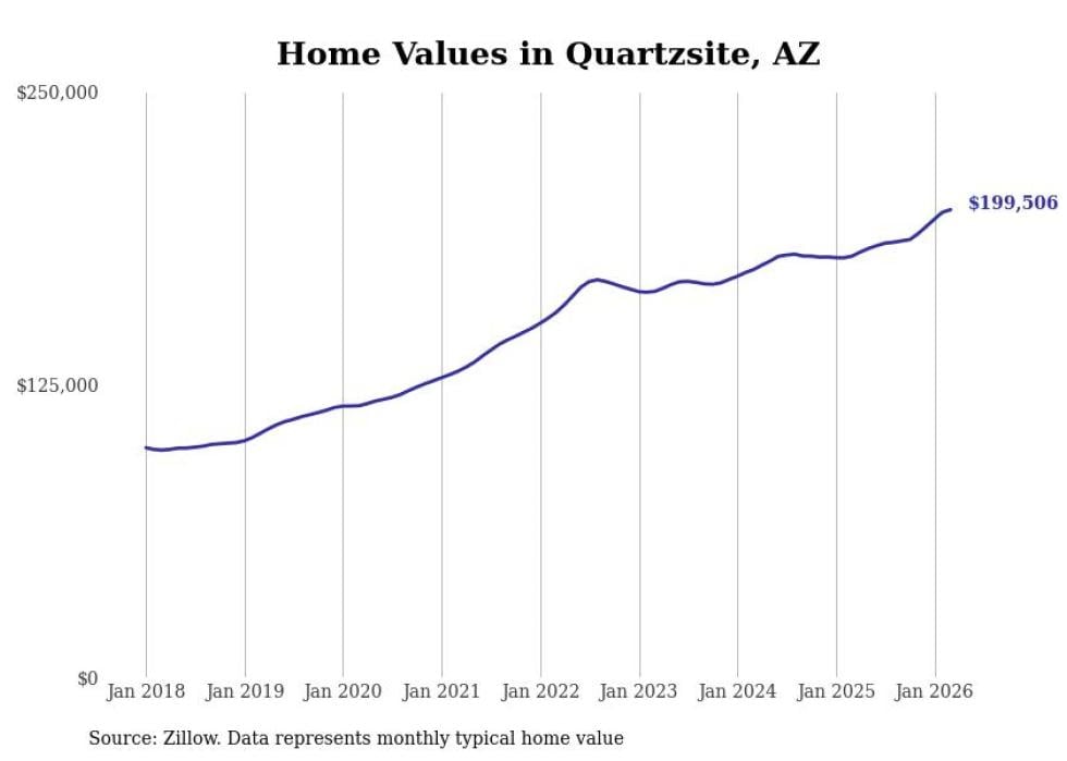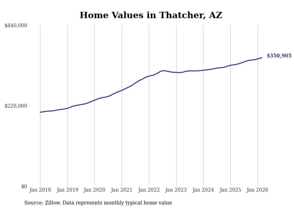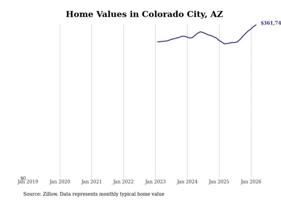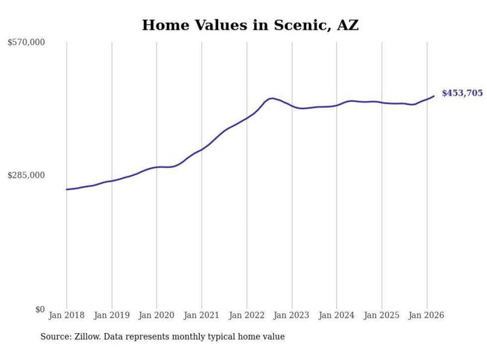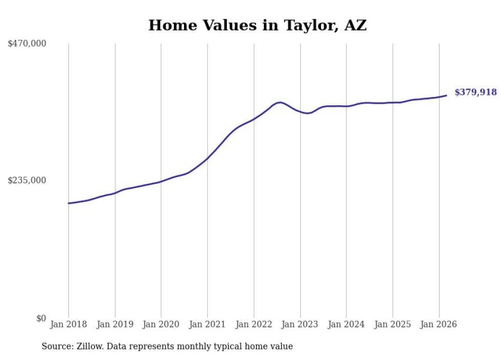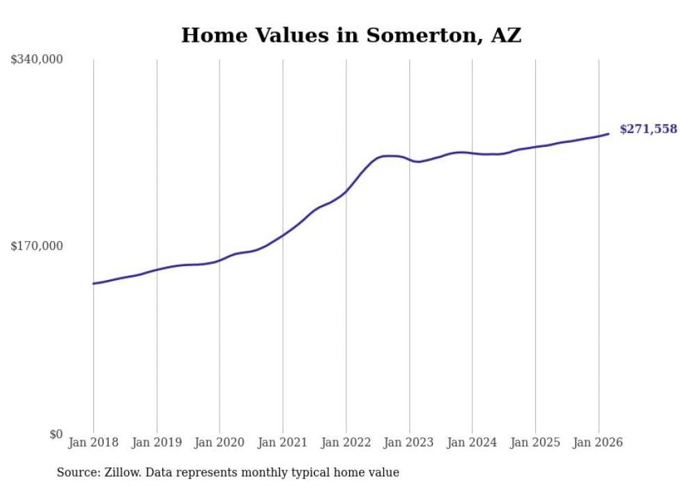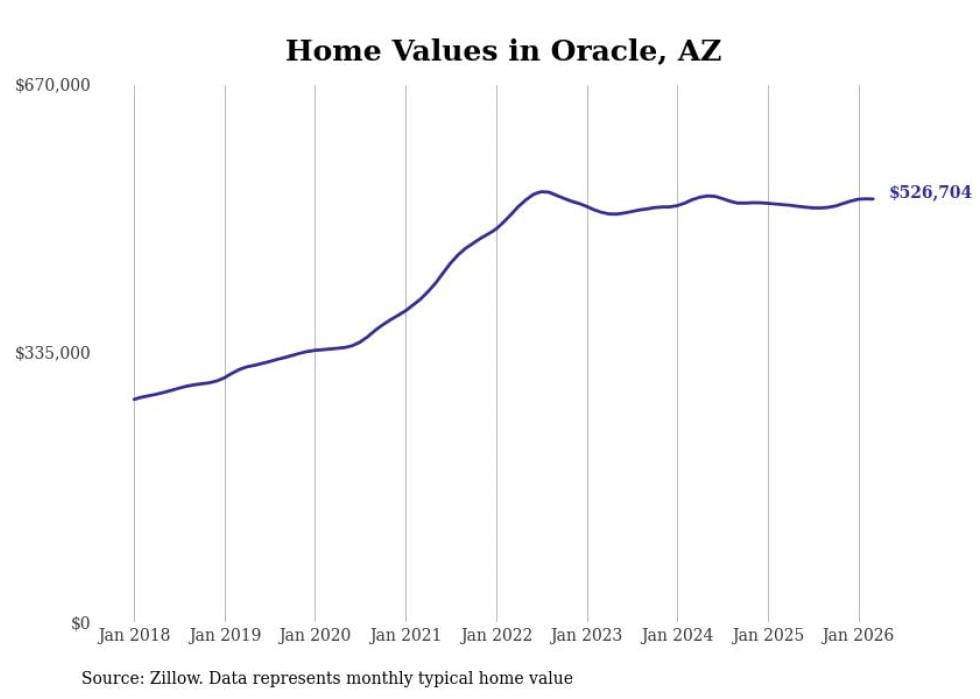 compiled a list of cities with the fastest-growing home prices in Arizona using data from . Cities are ranked by the dollar change in the Zillow Home Values Index for all homes from the 12 months ending March 2026. The charts in this story were created automatically using . Data was available for 50 cities and towns in Arizona.