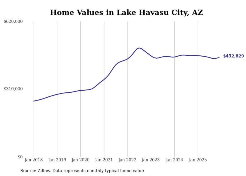 compiled a list of cities with the most expensive homes in the Lake Havasu City-Kingman, AZ metro area using data from . Charts show the monthly typical home value since January 2018.