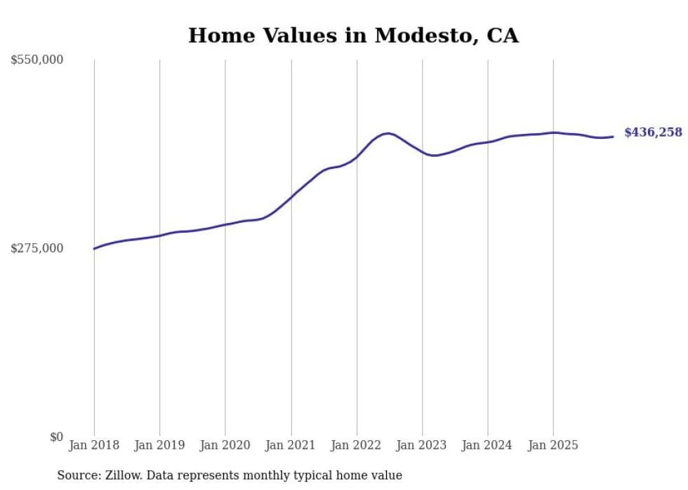 compiled a list of cities with the most expensive homes in the Modesto metro area using data from . Charts show the monthly typical home value since January 2018. All 16 cities and towns with data available were included in the list.