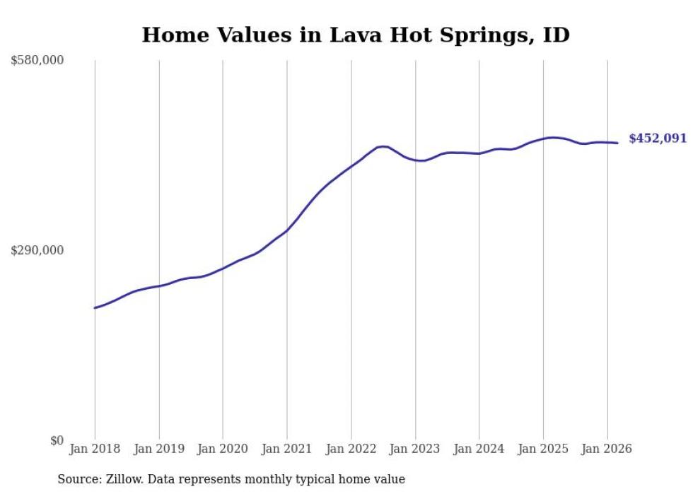 compiled a list of cities with the most expensive homes in the Pocatello metro area using data from . Charts show the monthly typical home value since January 2018. All 9 cities and towns with data available were included in the list.