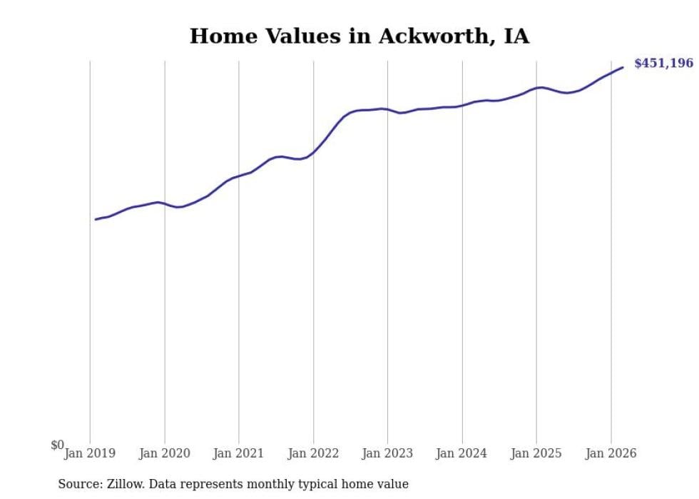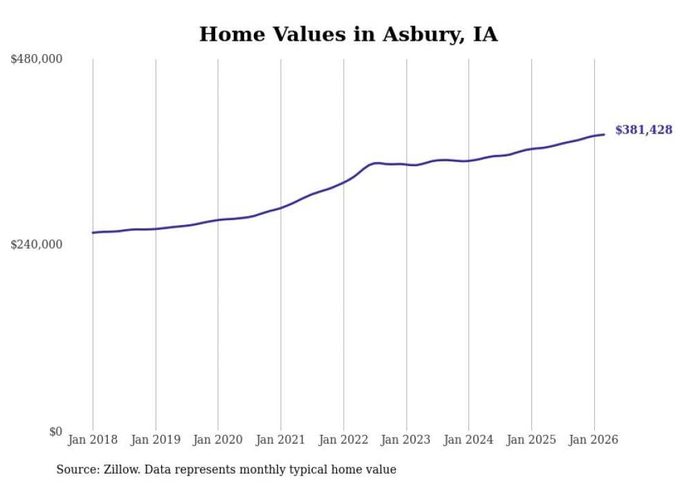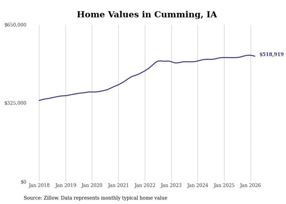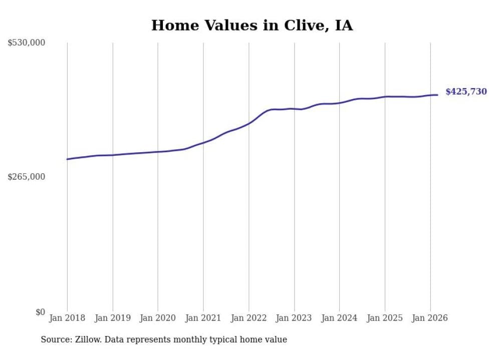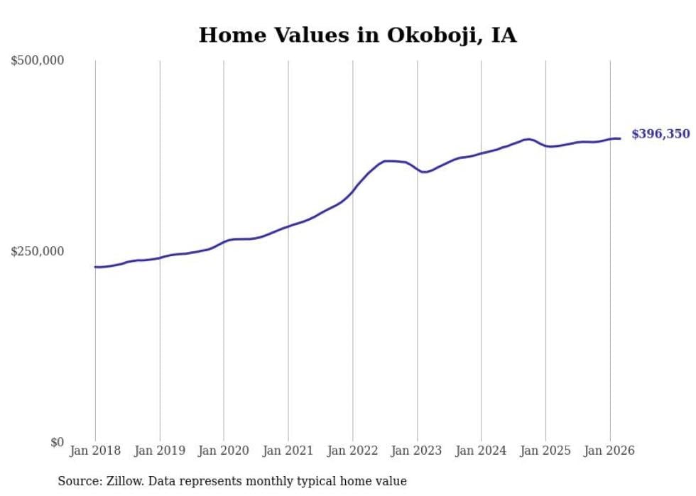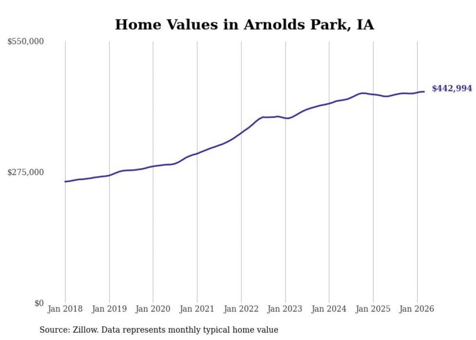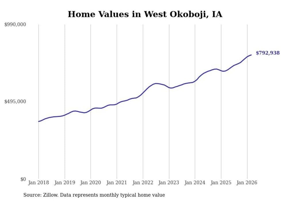 compiled a list of cities with the most expensive homes in Iowa using data from . Cities are ranked by the Zillow Home Values Index for all homes as of March 2026. The charts in this story were created automatically using .