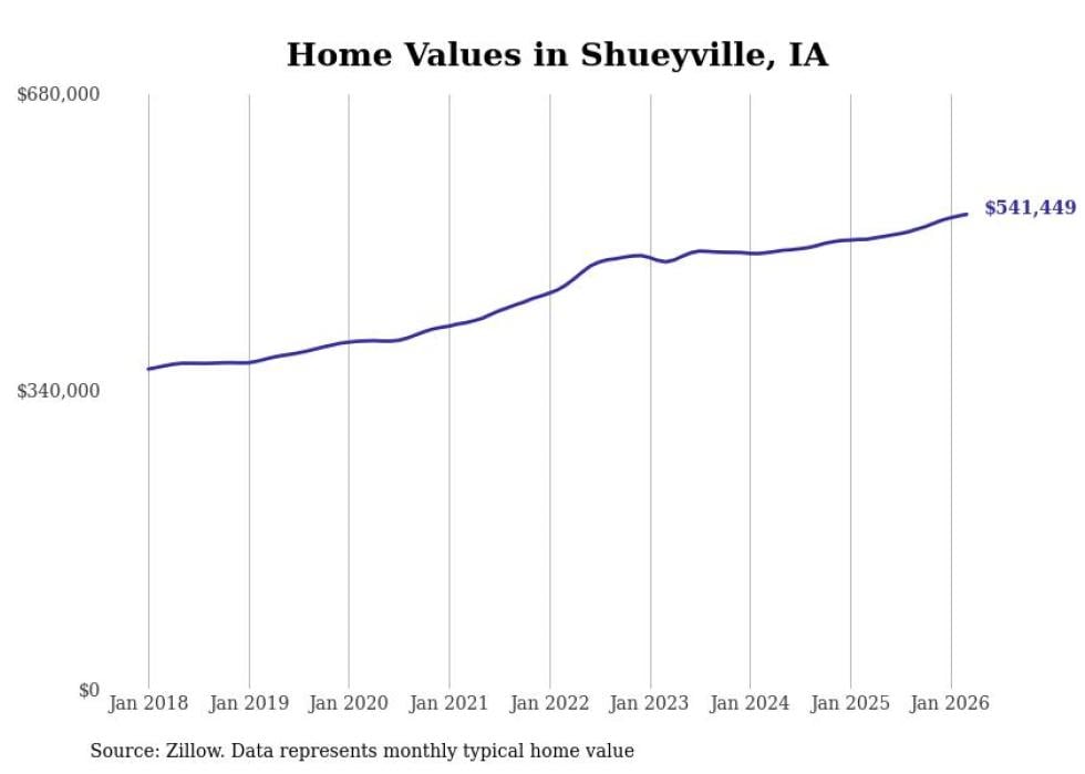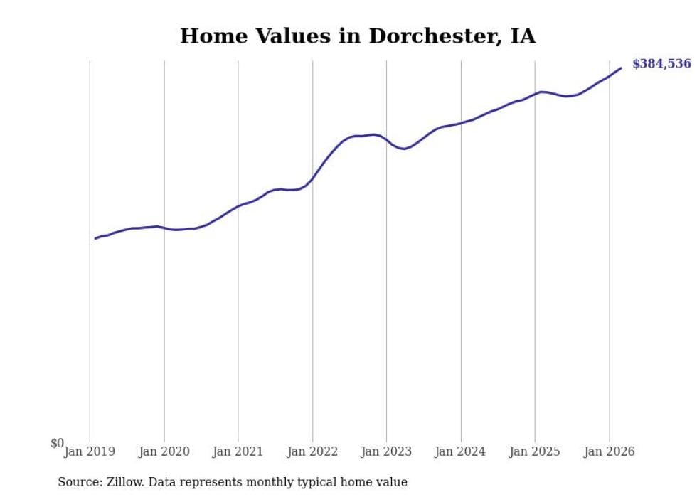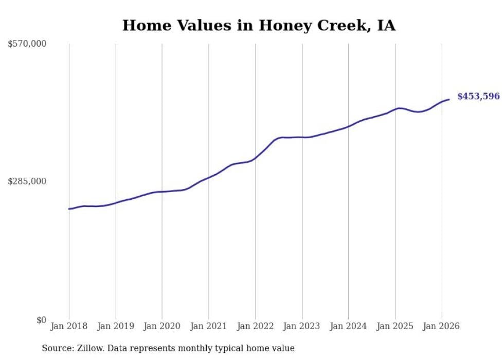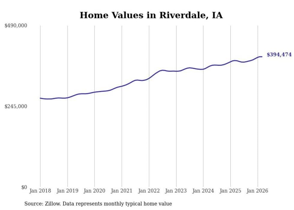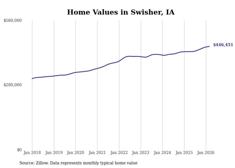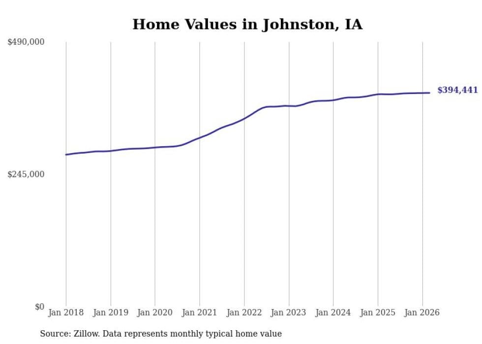 compiled a list of cities with the most expensive homes in Iowa using data from . Cities are ranked by the Zillow Home Values Index for all homes as of March 2026. The charts in this story were created automatically using .
