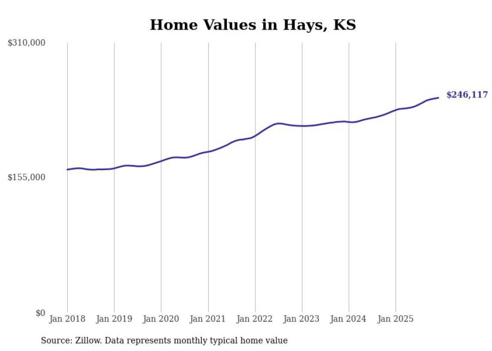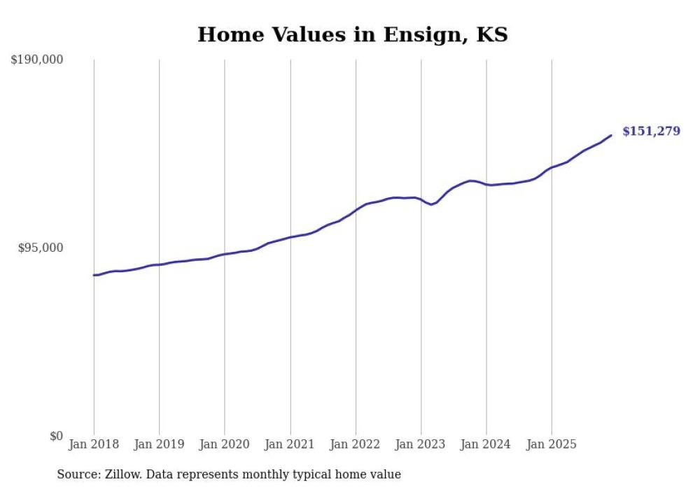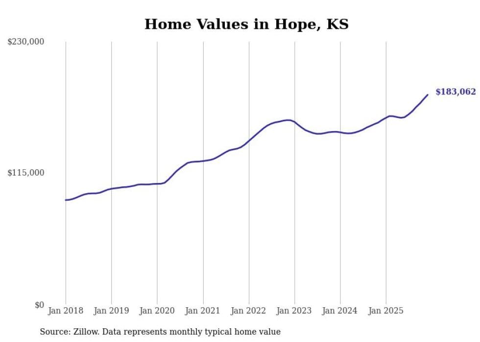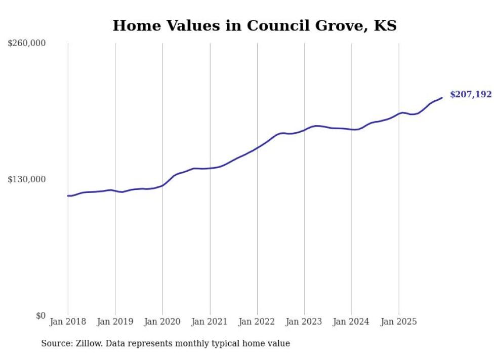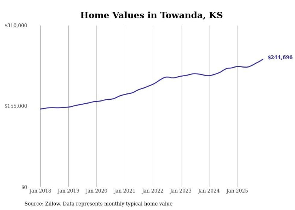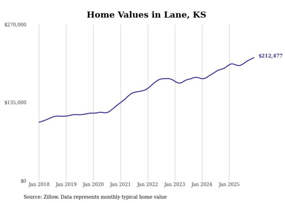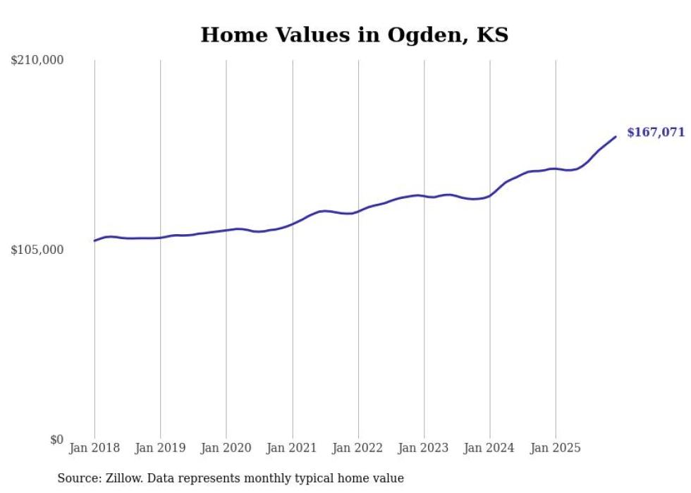 compiled a list of cities with the fastest-growing home prices in Kansas using data from . Cities are ranked by the dollar change in the Zillow Home Values Index for all homes from the 12 months ending December 2025. The charts in this story were created automatically using . Data was available for 50 cities and towns in Kansas.