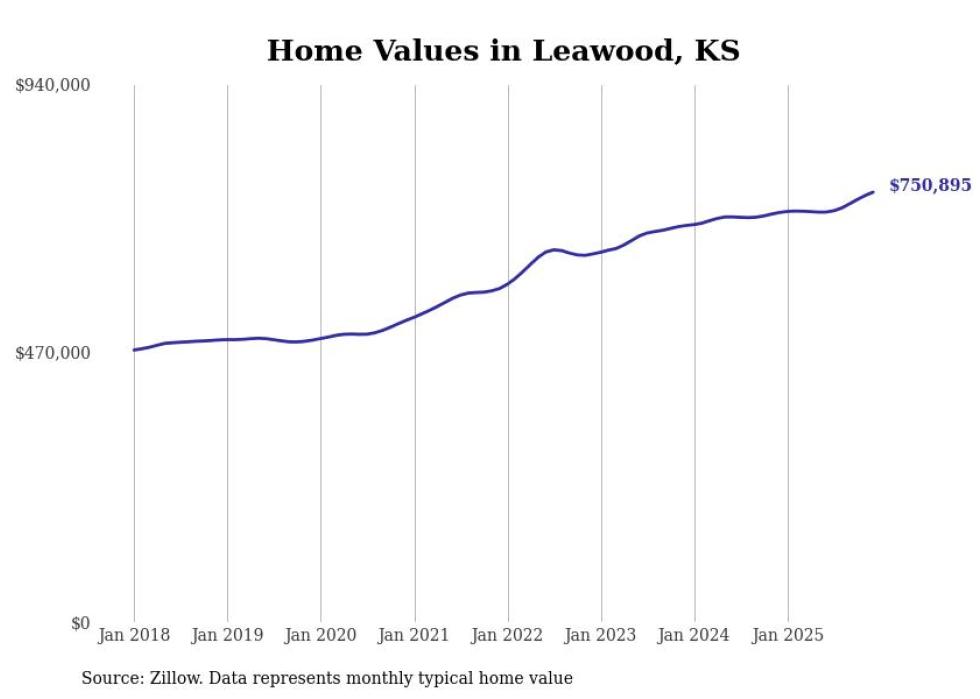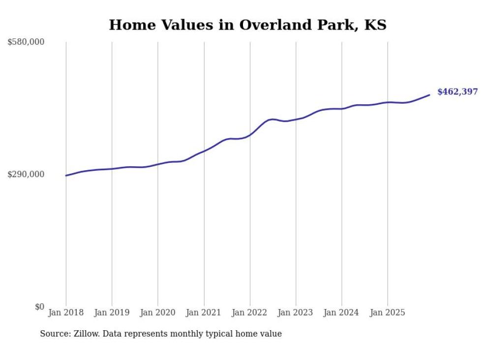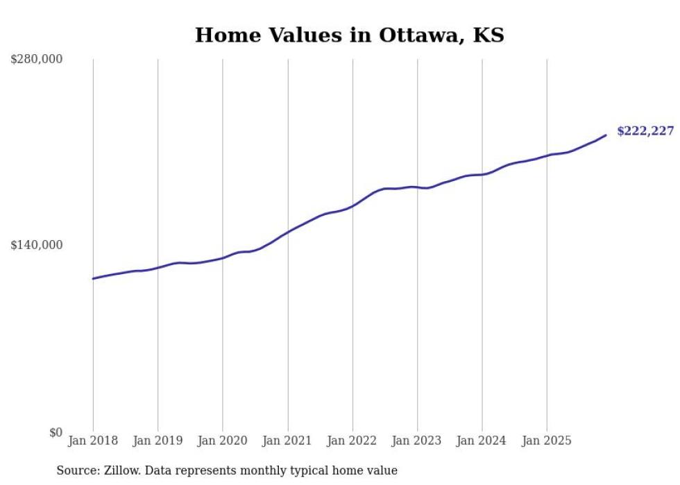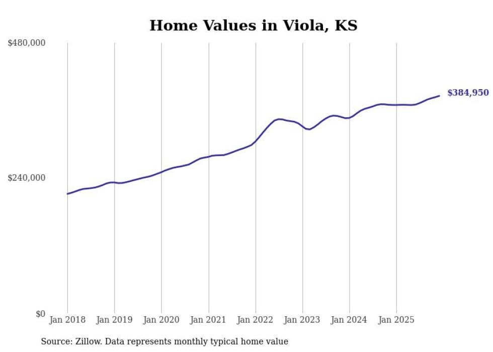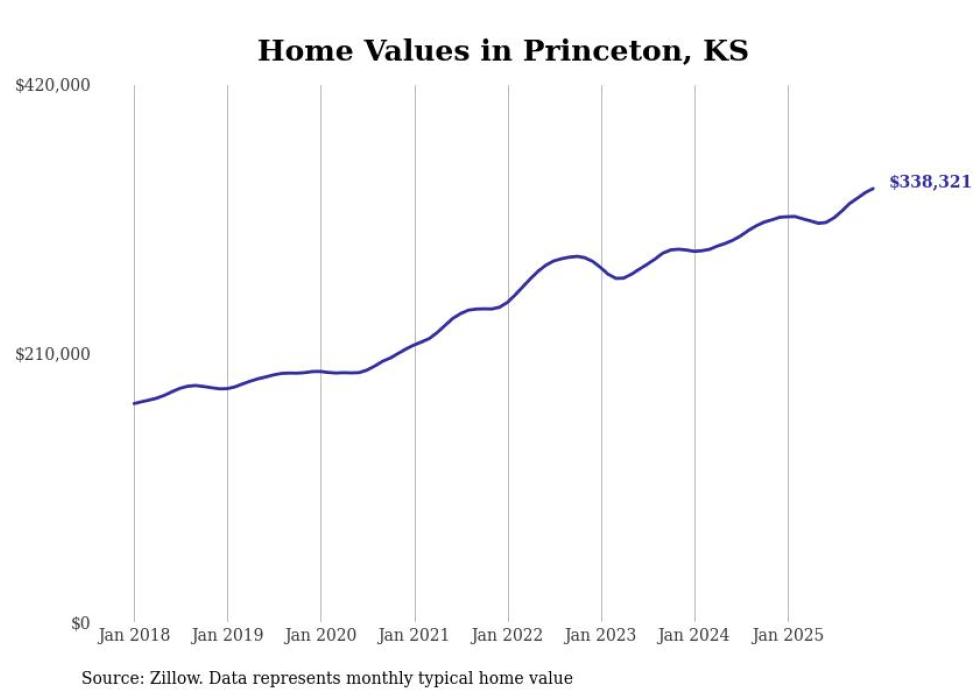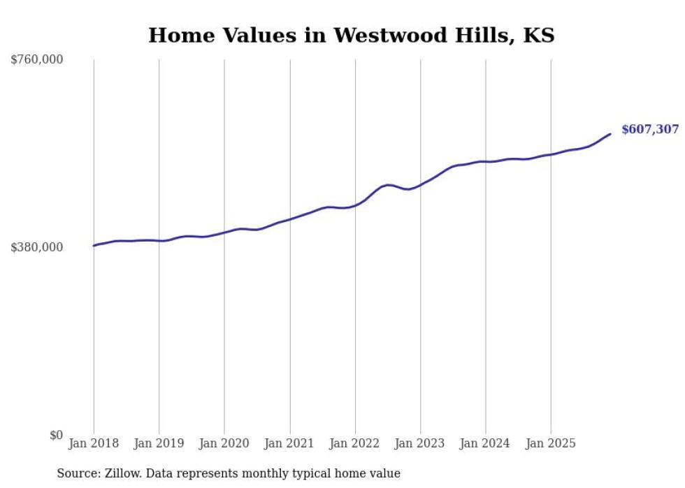 compiled a list of cities with the fastest-growing home prices in Kansas using data from . Cities are ranked by the dollar change in the Zillow Home Values Index for all homes from the 12 months ending December 2025. The charts in this story were created automatically using . Data was available for 50 cities and towns in Kansas.