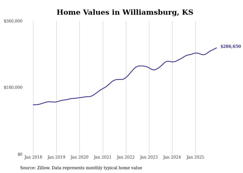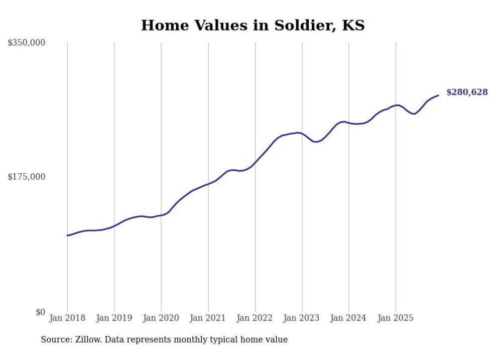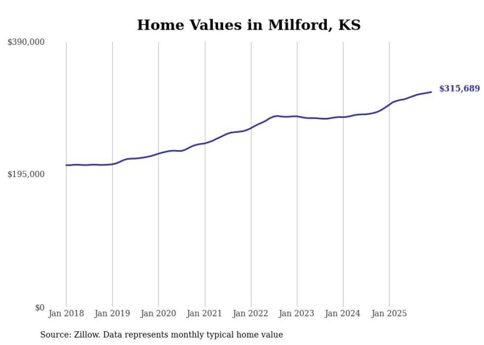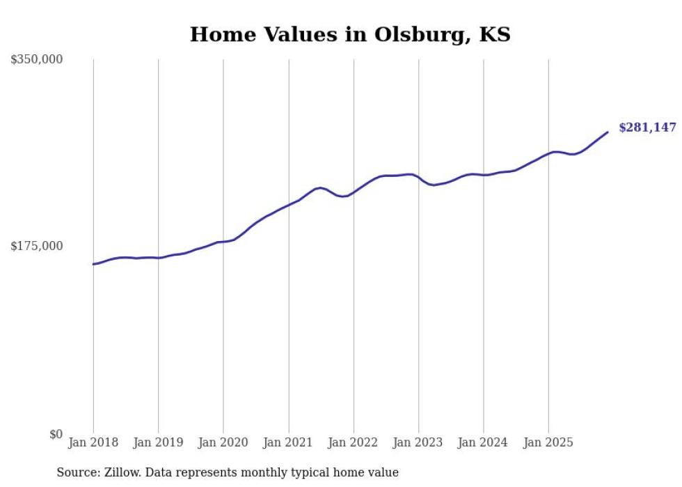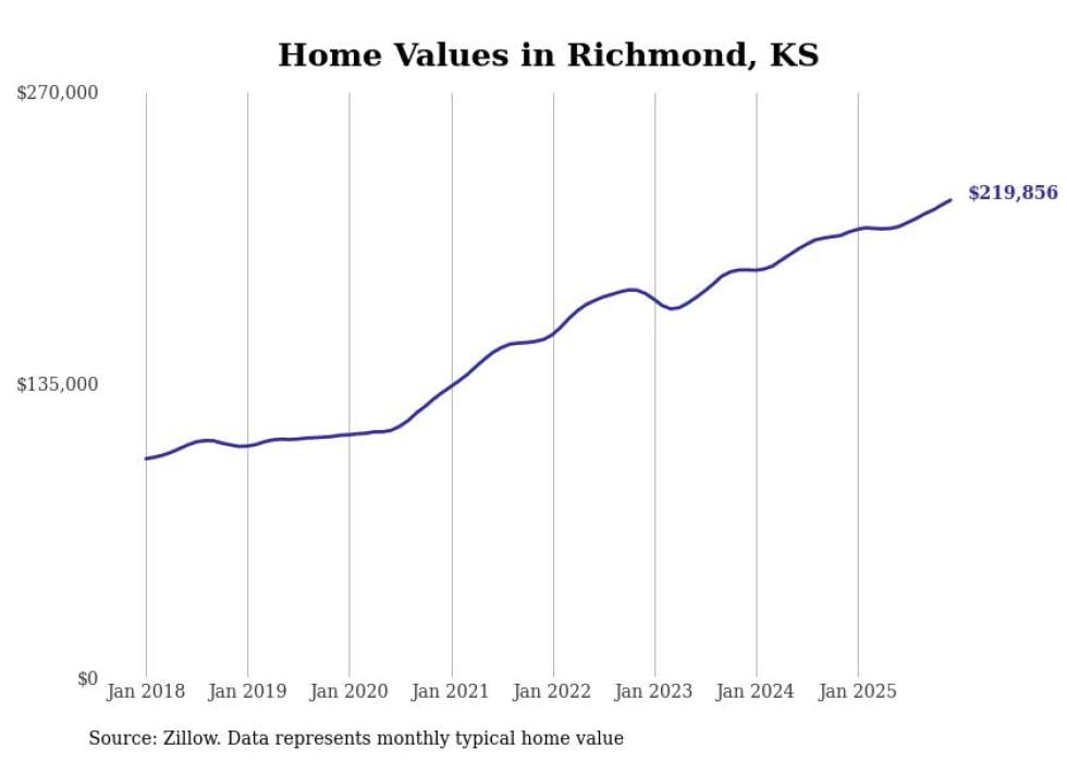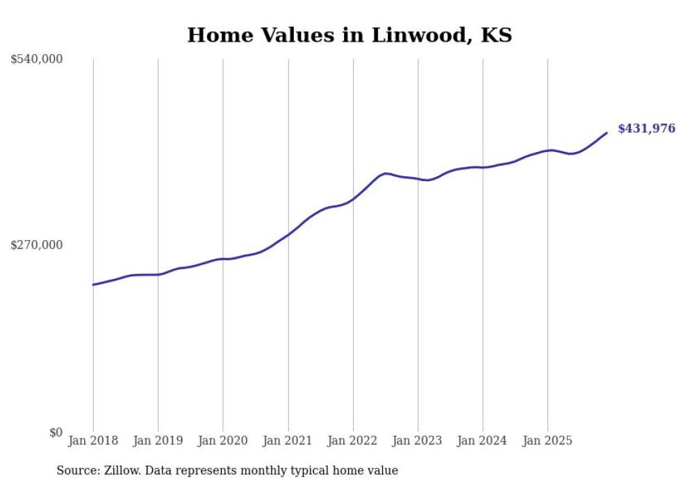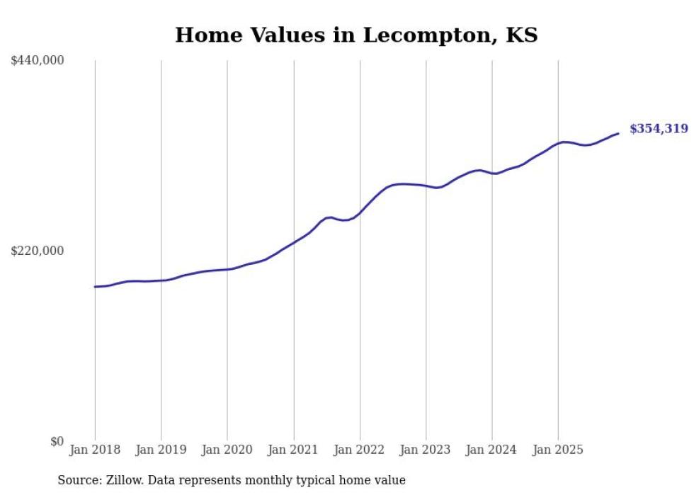 compiled a list of cities with the fastest-growing home prices in Kansas using data from . Cities are ranked by the dollar change in the Zillow Home Values Index for all homes from the 12 months ending December 2025. The charts in this story were created automatically using . Data was available for 50 cities and towns in Kansas.
