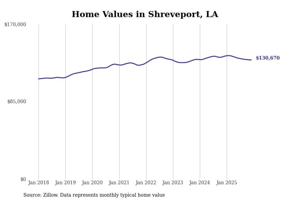compiled a list of cities with the most expensive homes in the Shreveport metro area using data from . Charts show the monthly typical home value since January 2018. All 19 cities and towns with data available were included in the list.