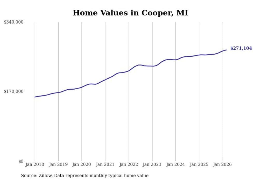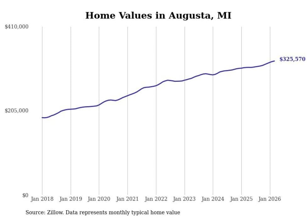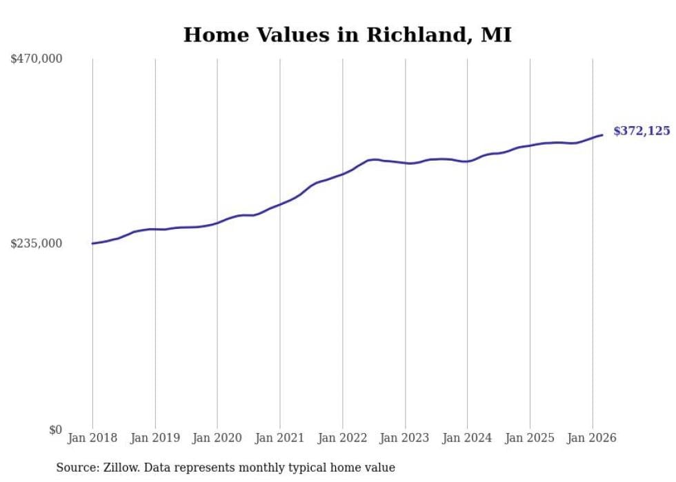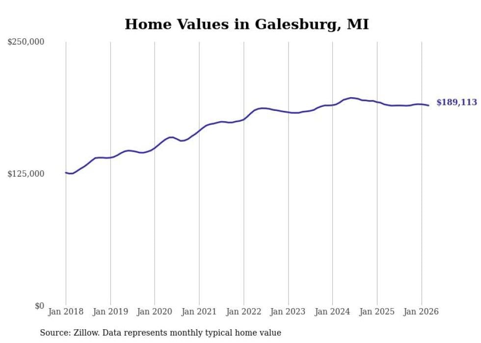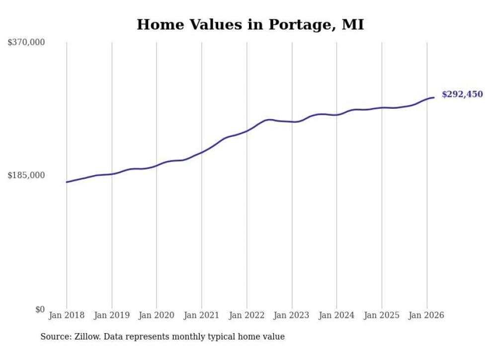 compiled a list of cities with the most expensive homes in the Kalamazoo-Portage, MI metro area using data from . Charts show the monthly typical home value since January 2018.