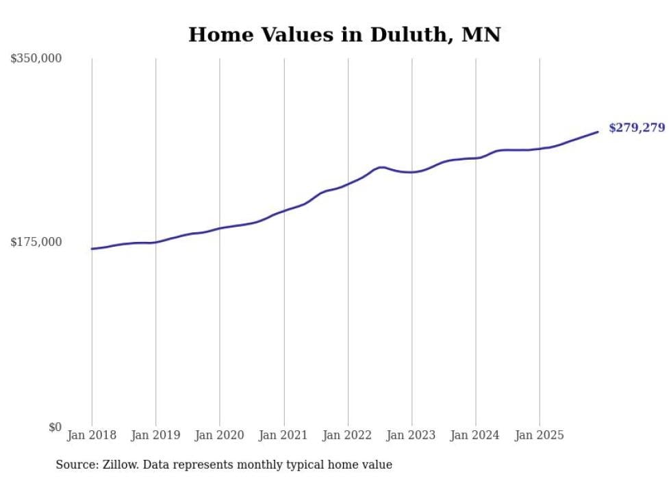 compiled a list of cities with the most expensive homes in the Duluth, MN-WI metro area using data from . Charts show the monthly typical home value since January 2018.