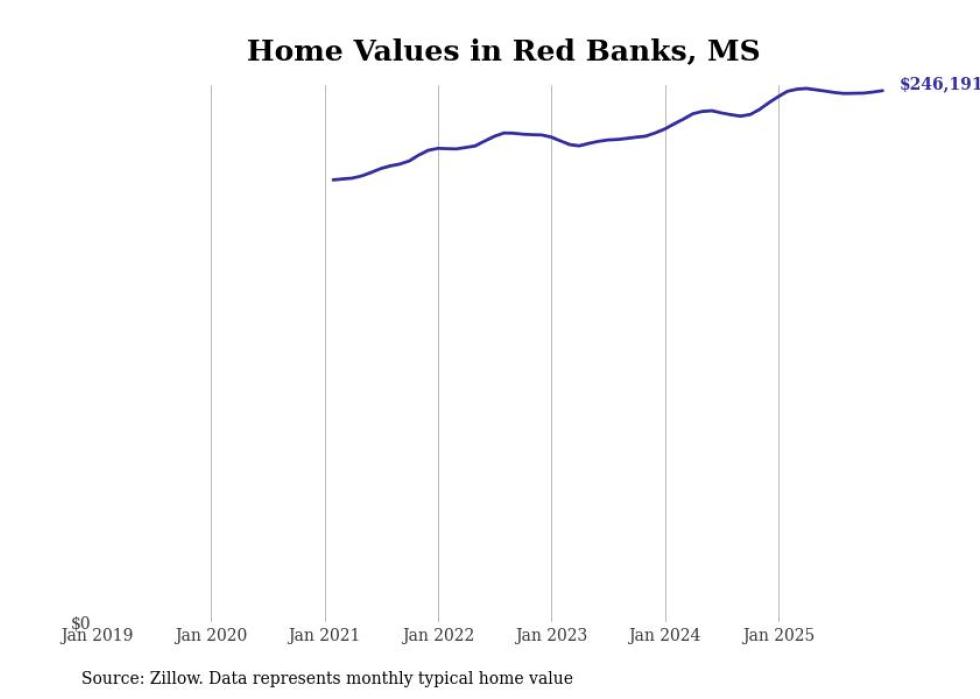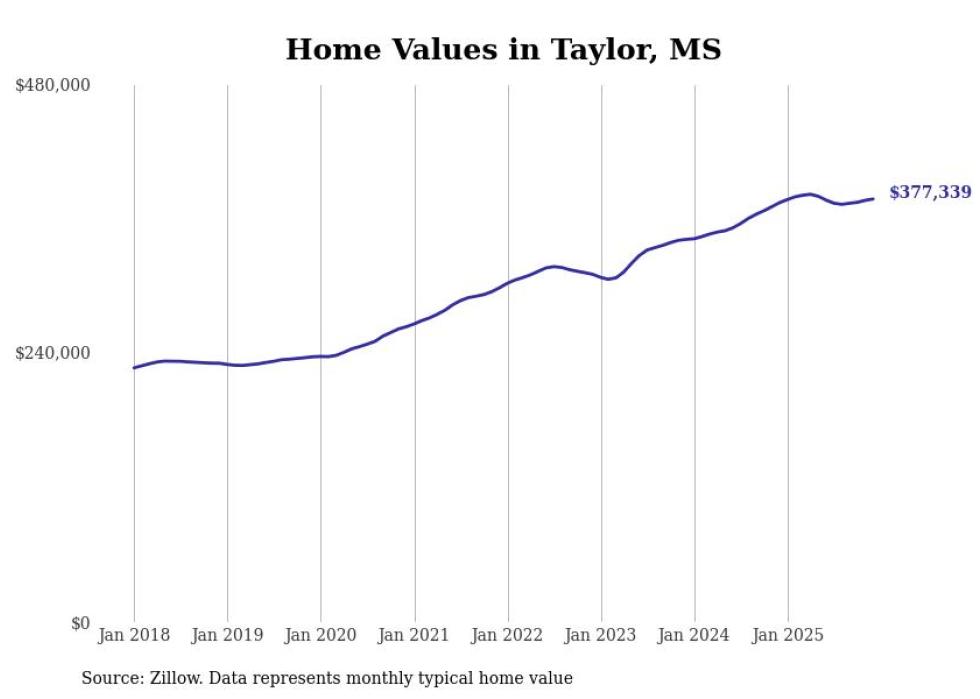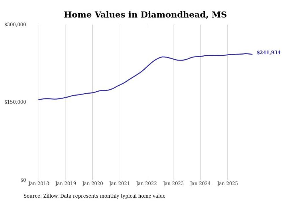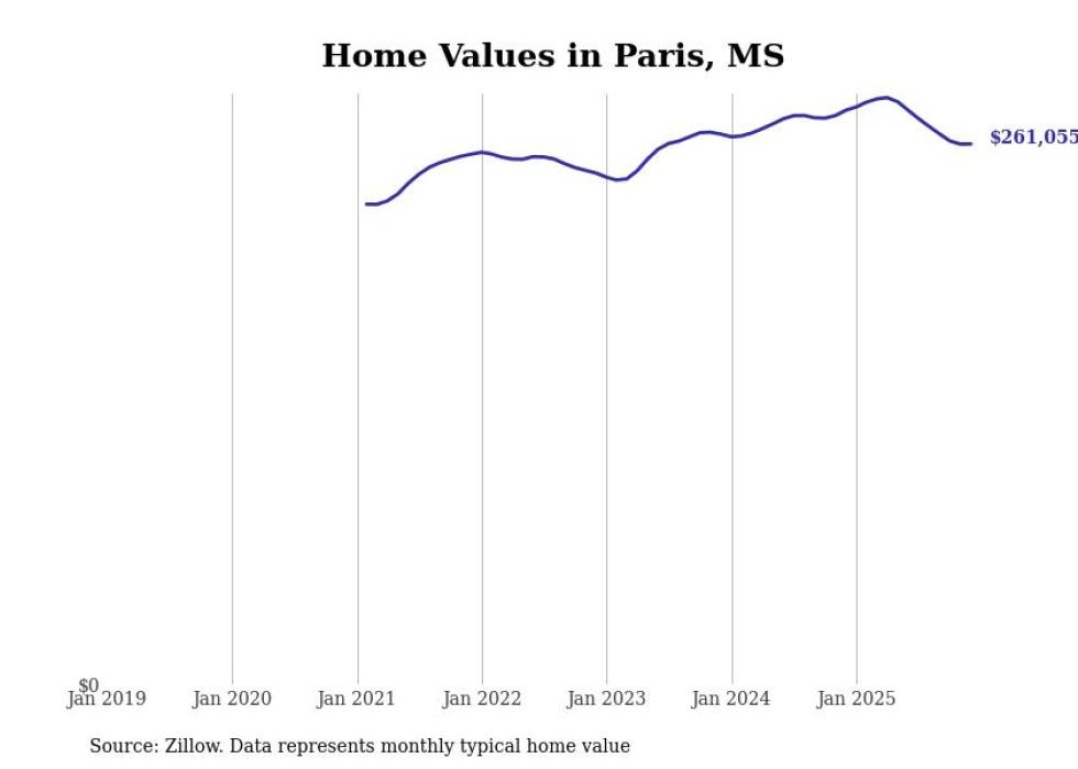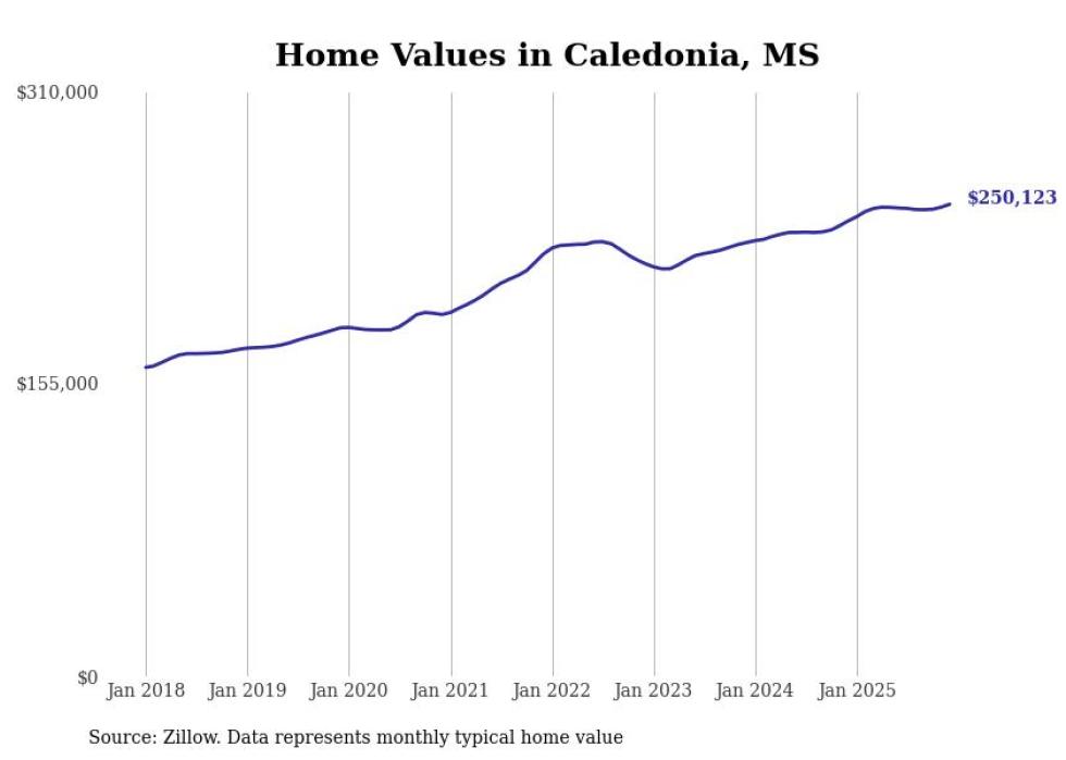 compiled a list of cities with the most expensive homes in Mississippi using data from . Cities are ranked by the Zillow Home Values Index for all homes as of December 2025. The charts in this story were created automatically using .