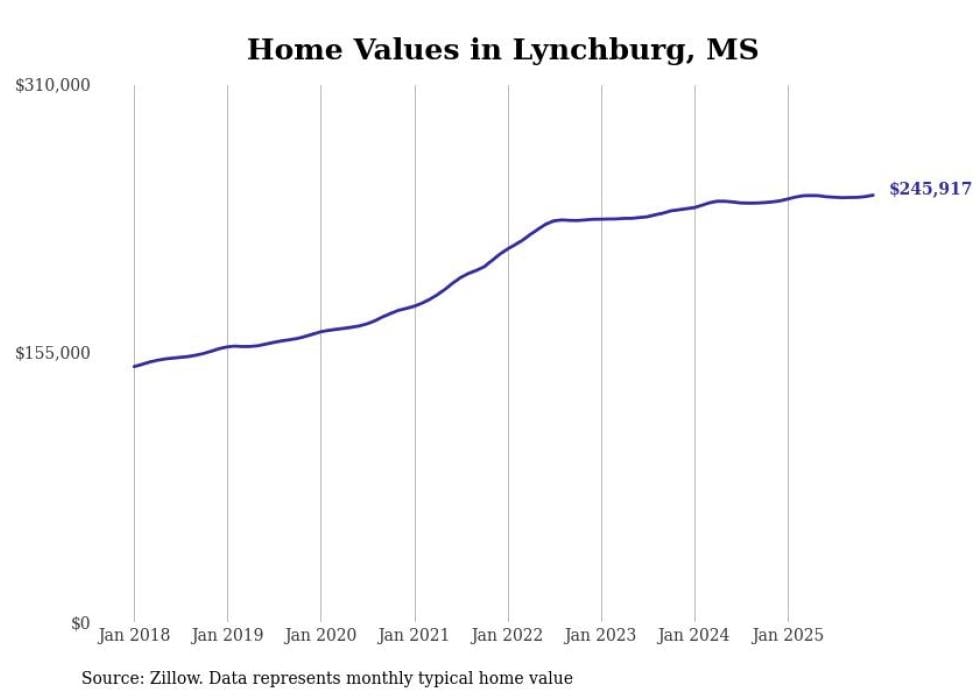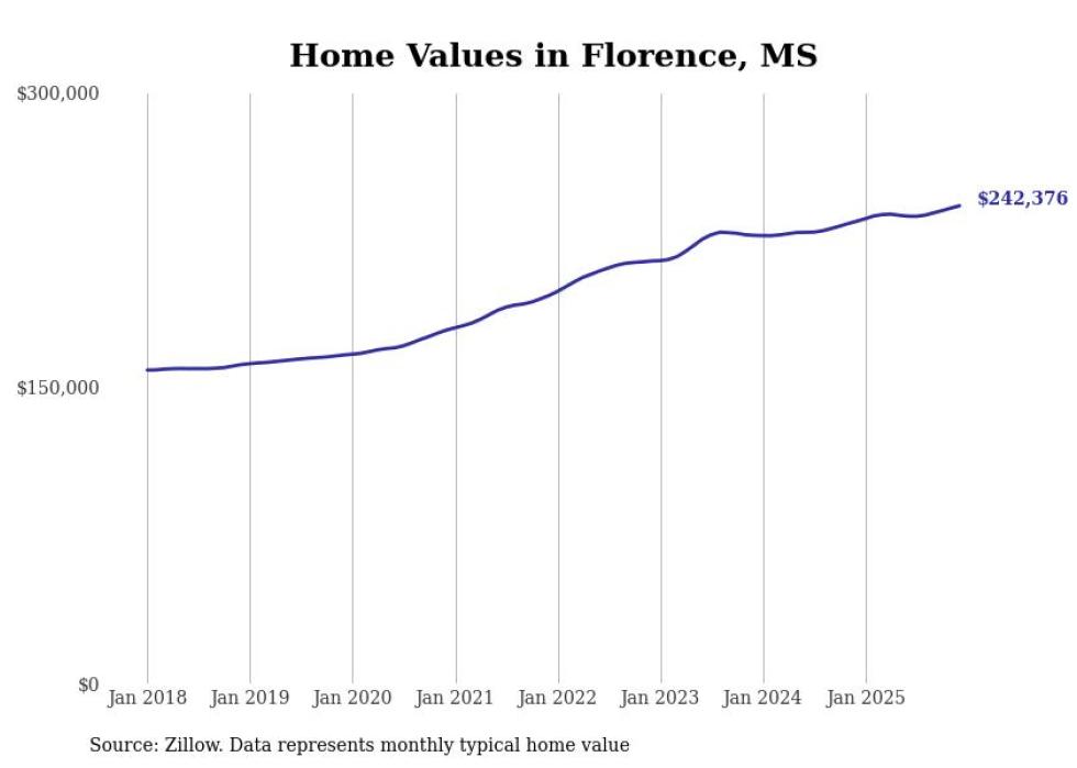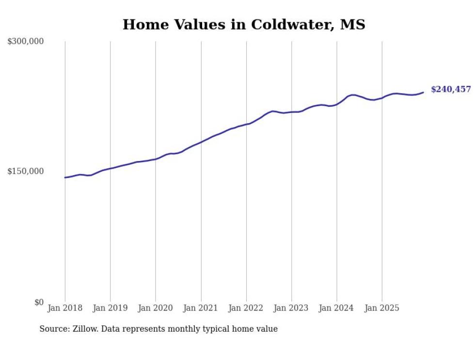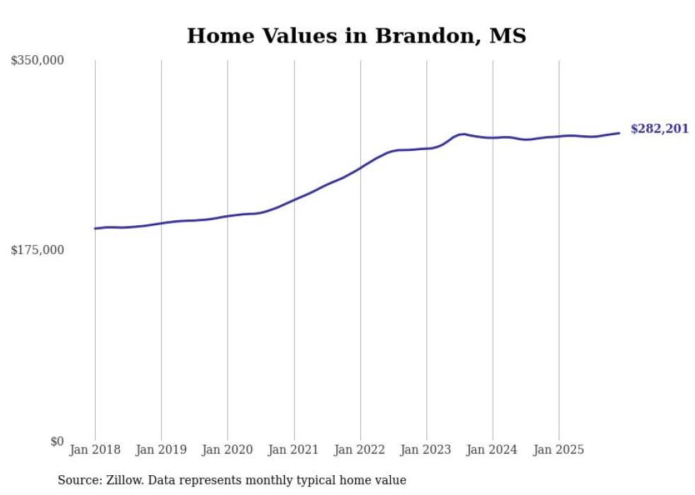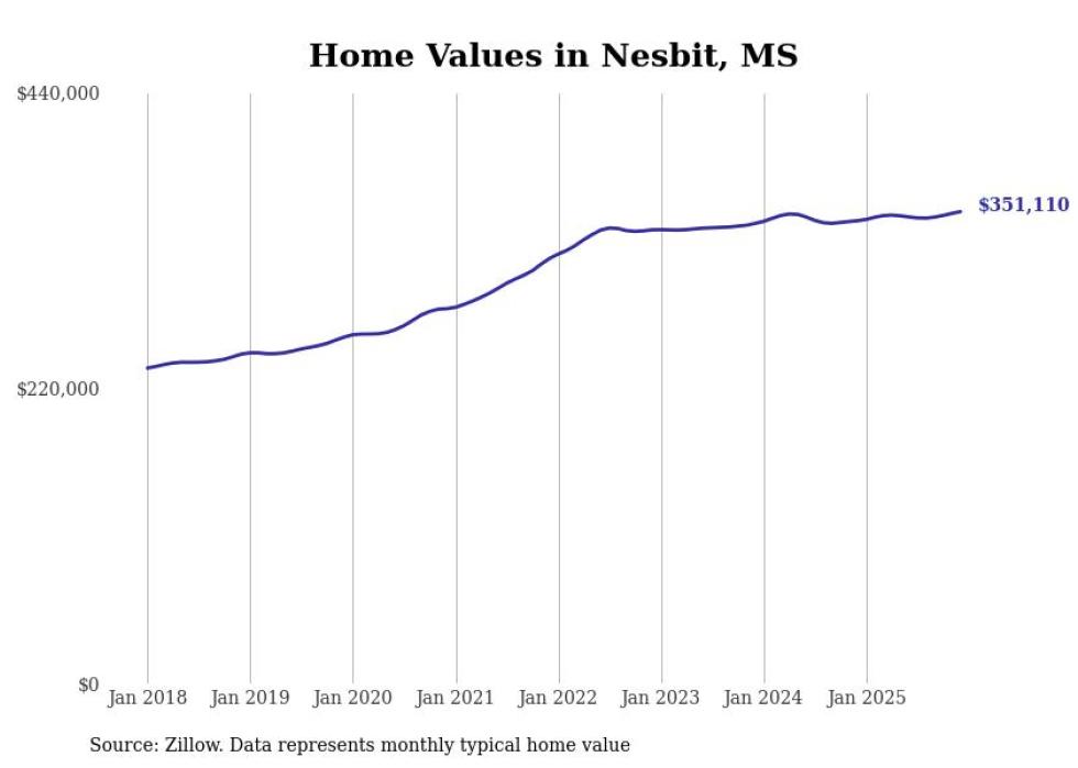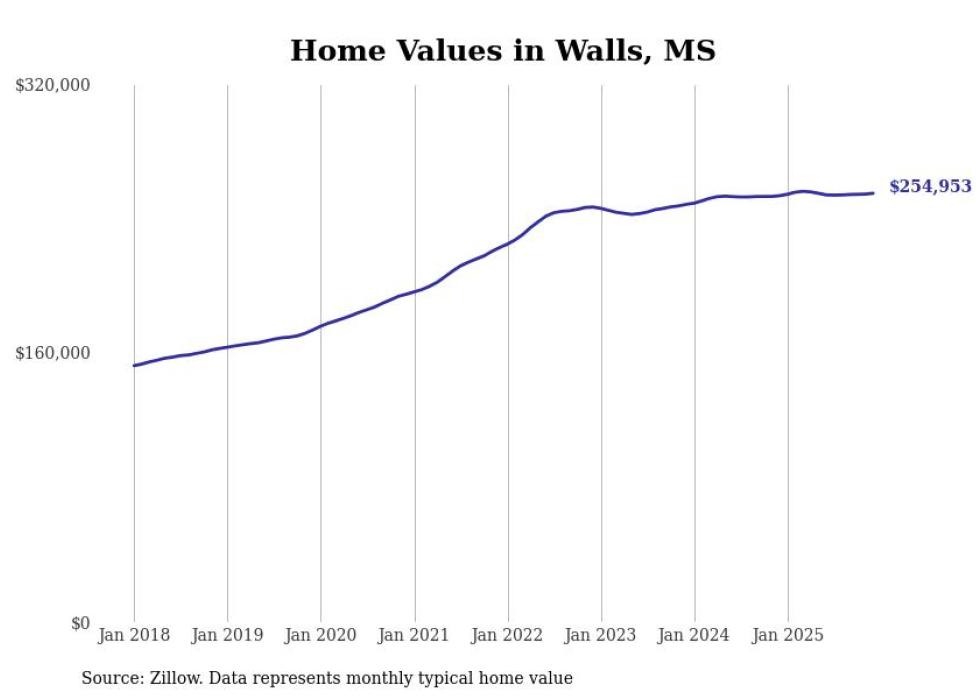 compiled a list of cities with the most expensive homes in Mississippi using data from . Cities are ranked by the Zillow Home Values Index for all homes as of December 2025. The charts in this story were created automatically using .