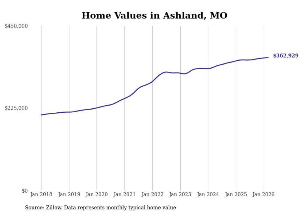 compiled a list of cities with the most expensive homes in the Columbia, Missouri metro area using data from . Charts show the monthly typical home value since January 2018. All 13 cities and towns with data available were included in the list.