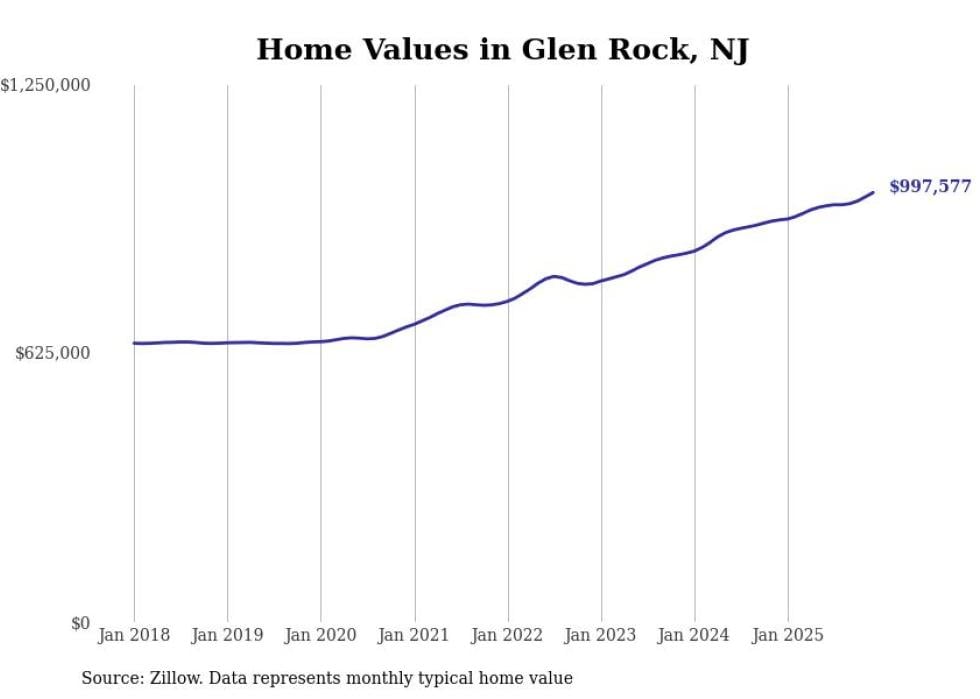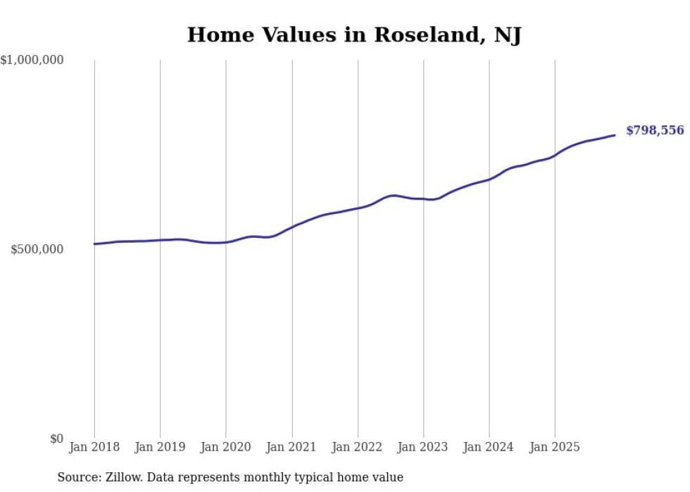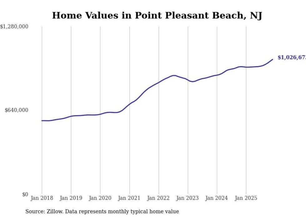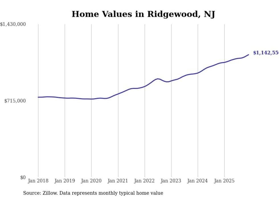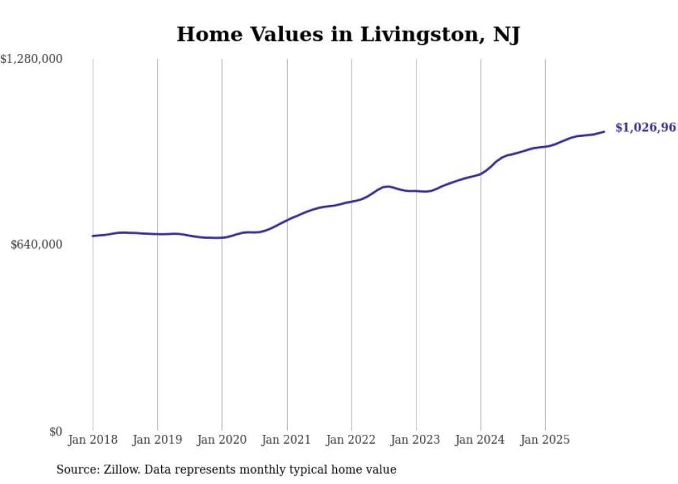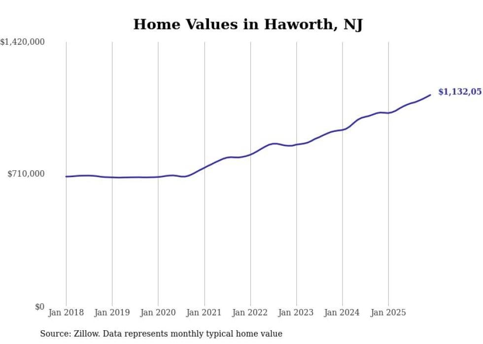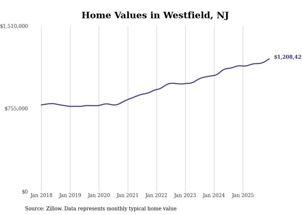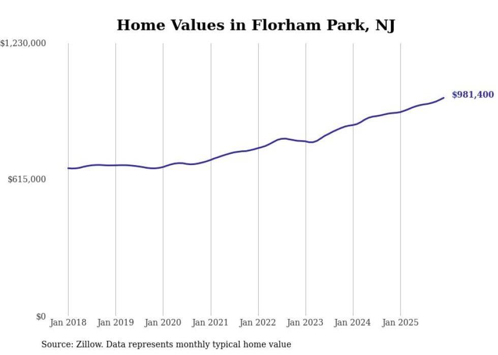 compiled a list of cities with the fastest-growing home prices in New Jersey using data from . Cities are ranked by the dollar change in the Zillow Home Values Index for all homes from the 12 months ending December 2025. The charts in this story were created automatically using . Data was available for 50 cities and towns in New Jersey.