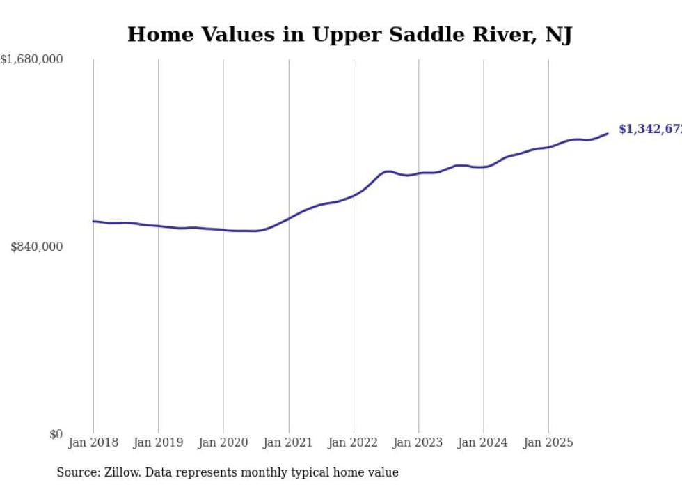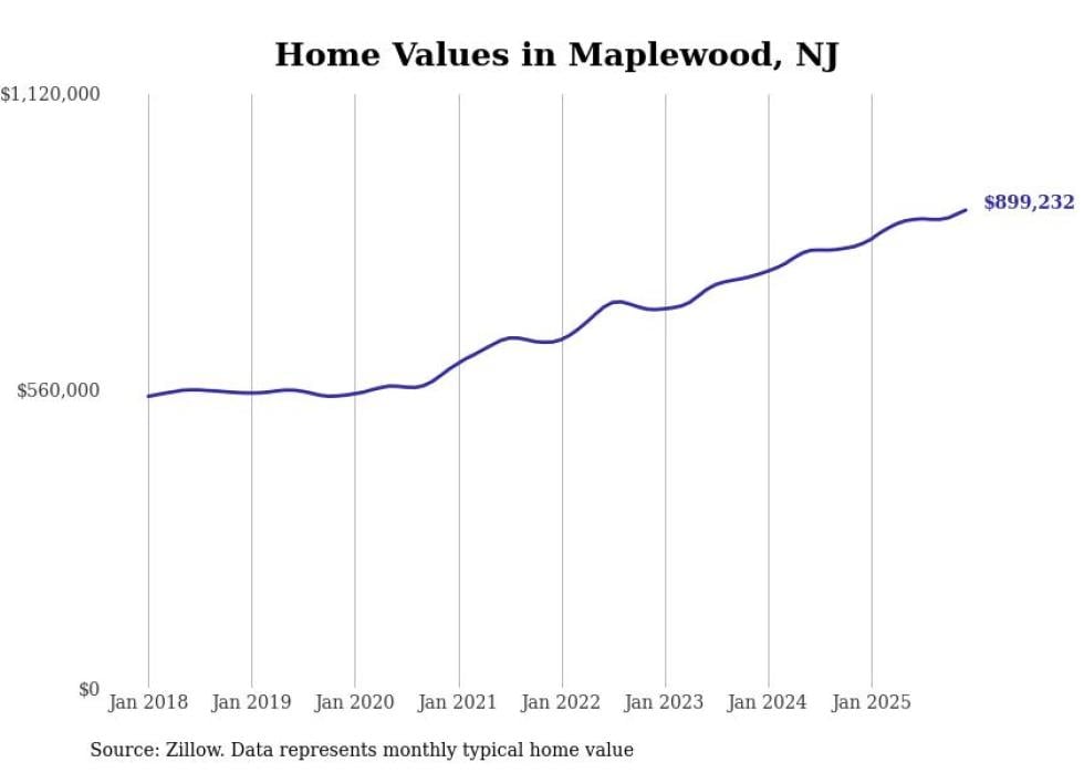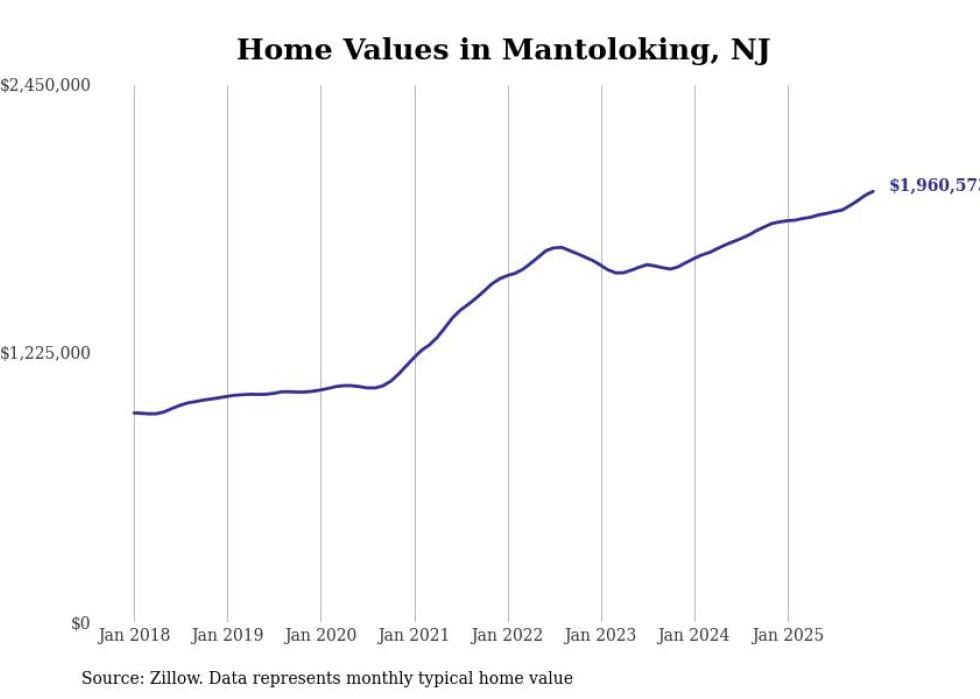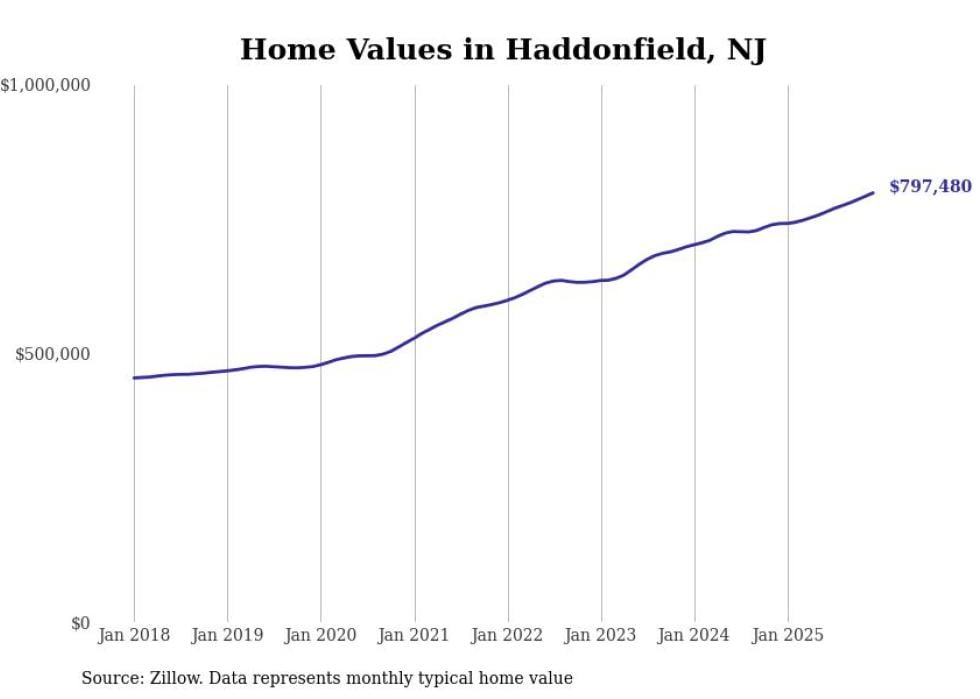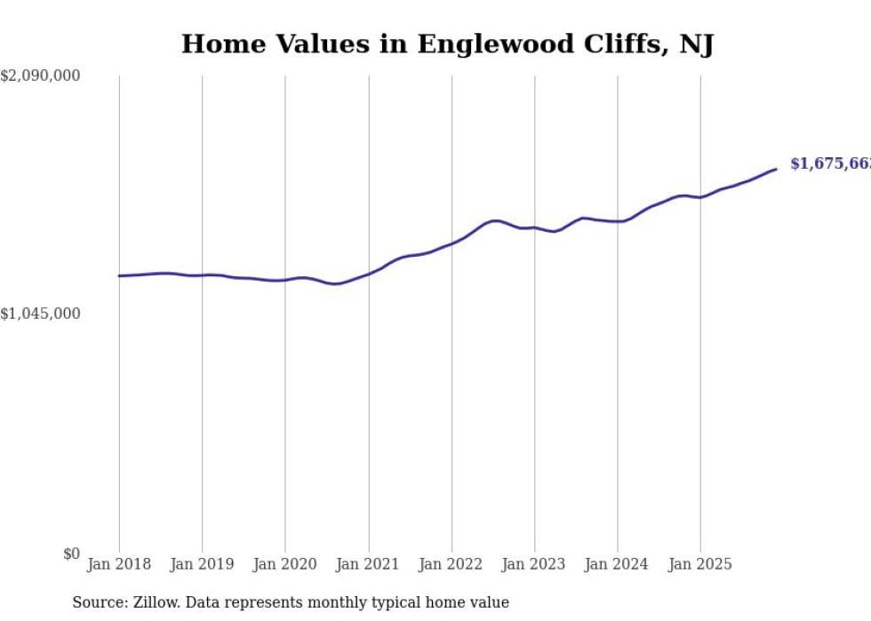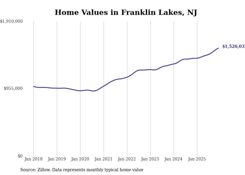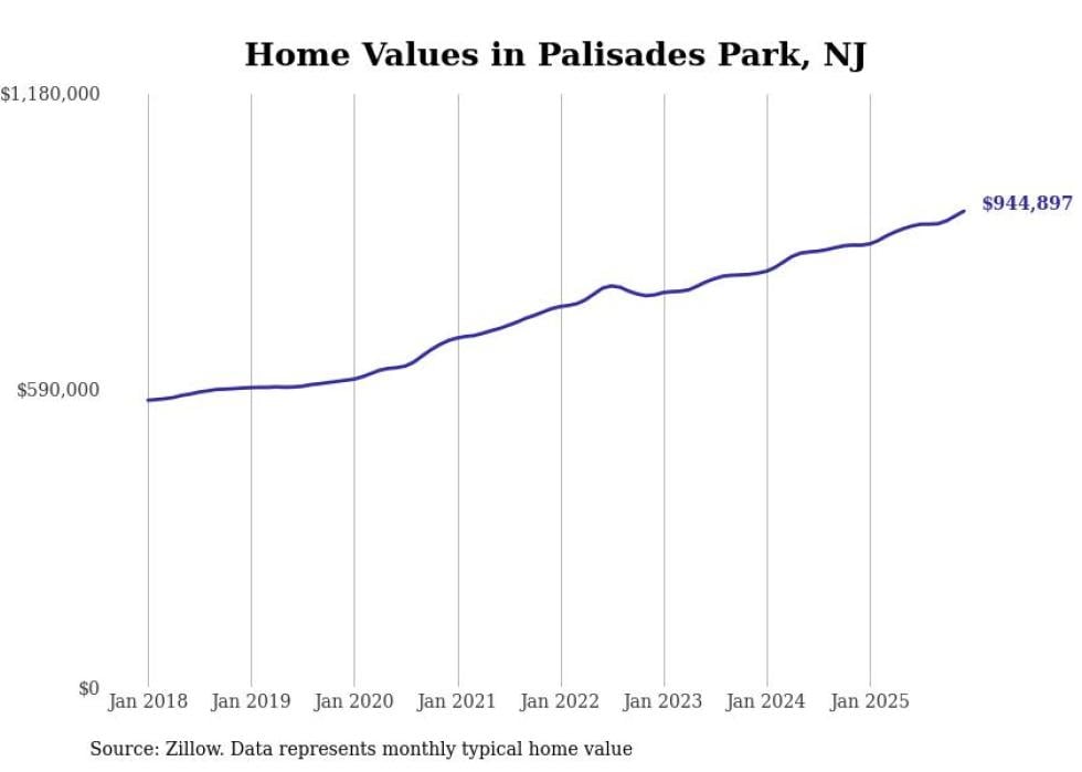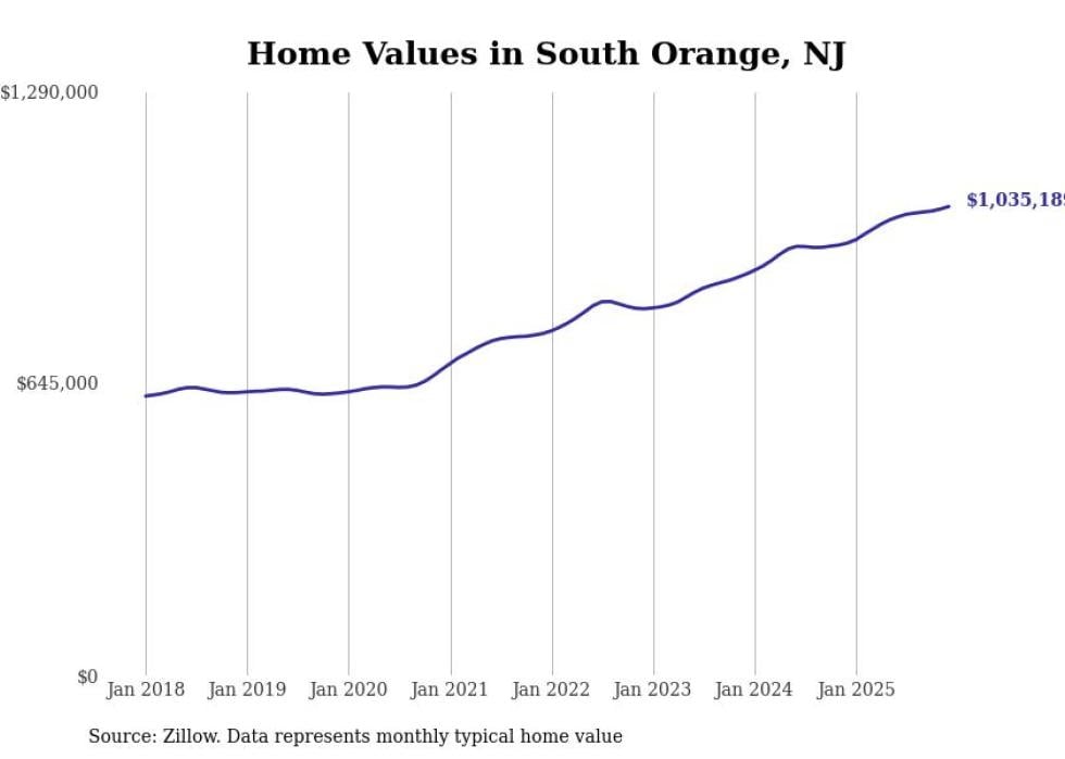 compiled a list of cities with the fastest-growing home prices in New Jersey using data from . Cities are ranked by the dollar change in the Zillow Home Values Index for all homes from the 12 months ending December 2025. The charts in this story were created automatically using . Data was available for 50 cities and towns in New Jersey.