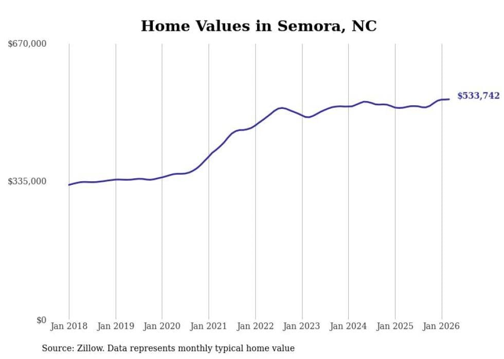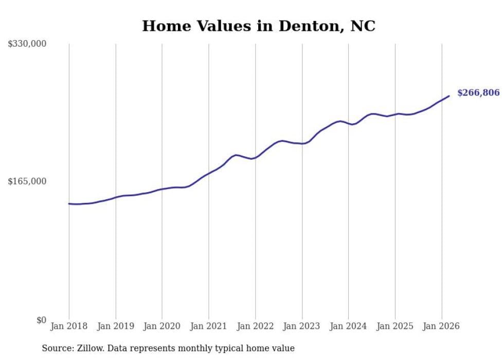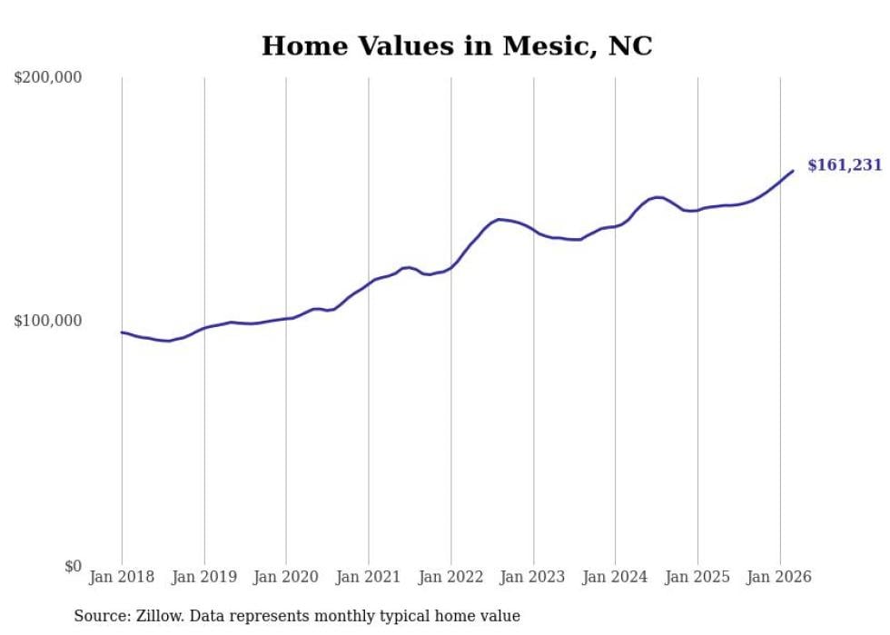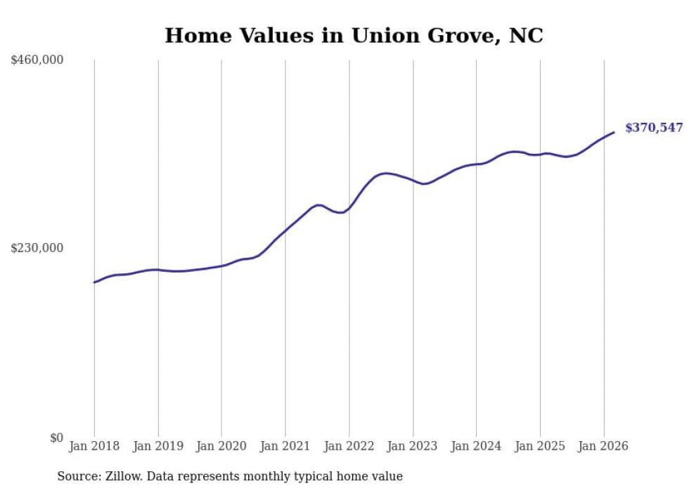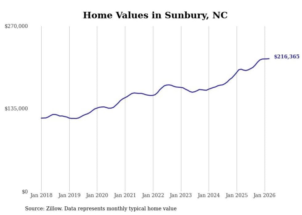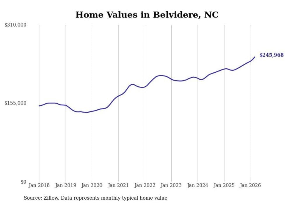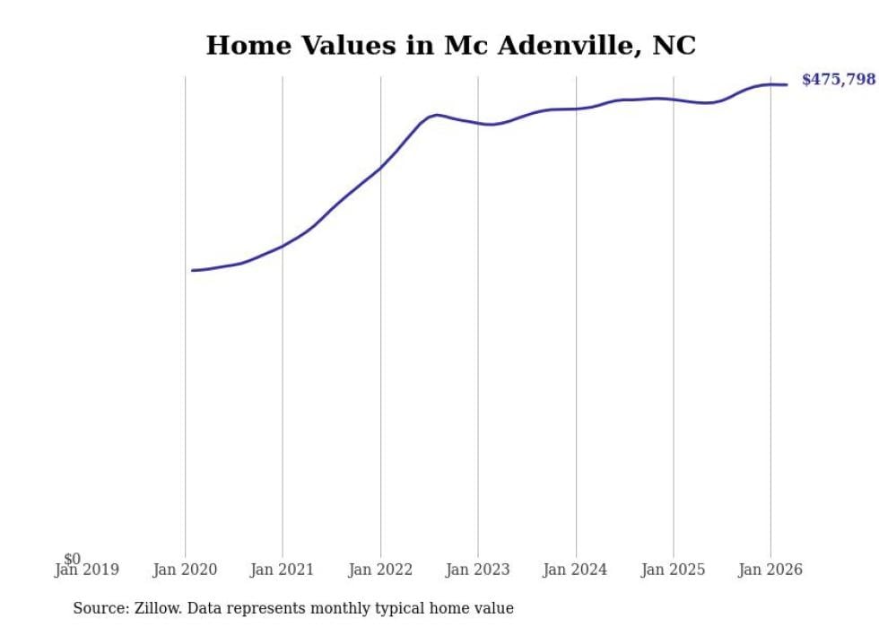 compiled a list of cities with the fastest-growing home prices in North Carolina using data from . Cities are ranked by the dollar change in the Zillow Home Values Index for all homes from the 12 months ending March 2026. The charts in this story were created automatically using . Data was available for 50 cities and towns in North Carolina.