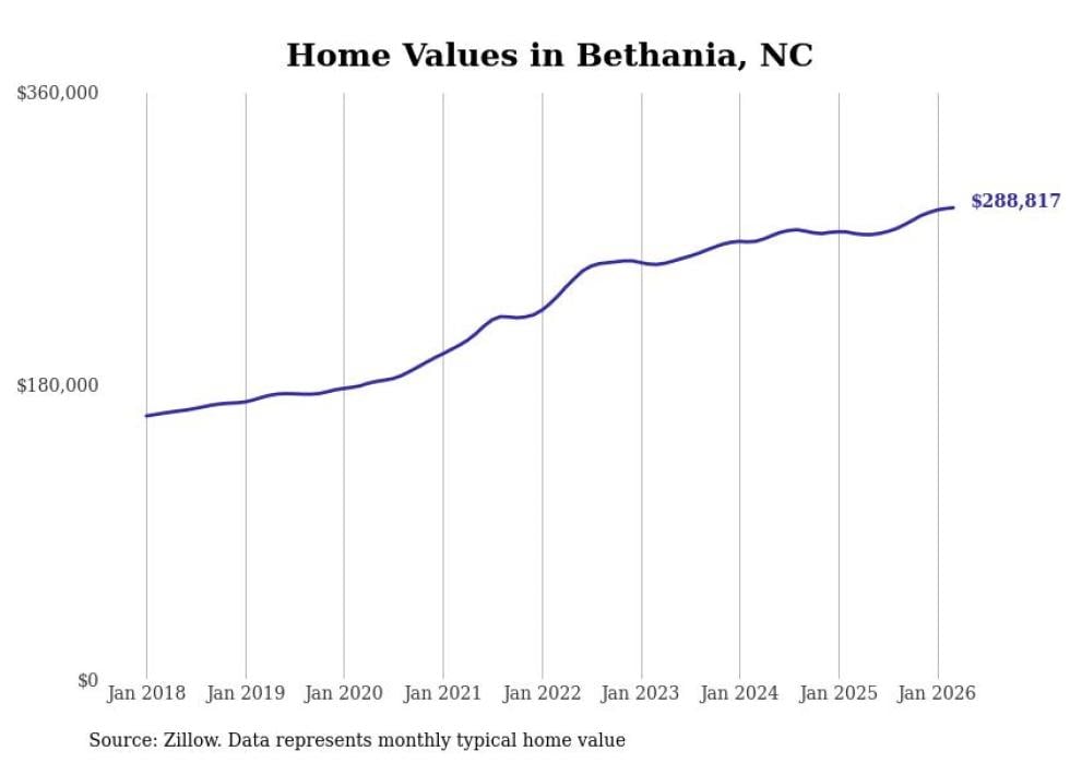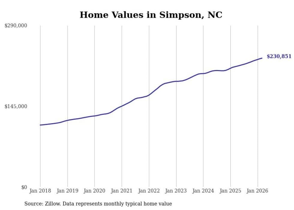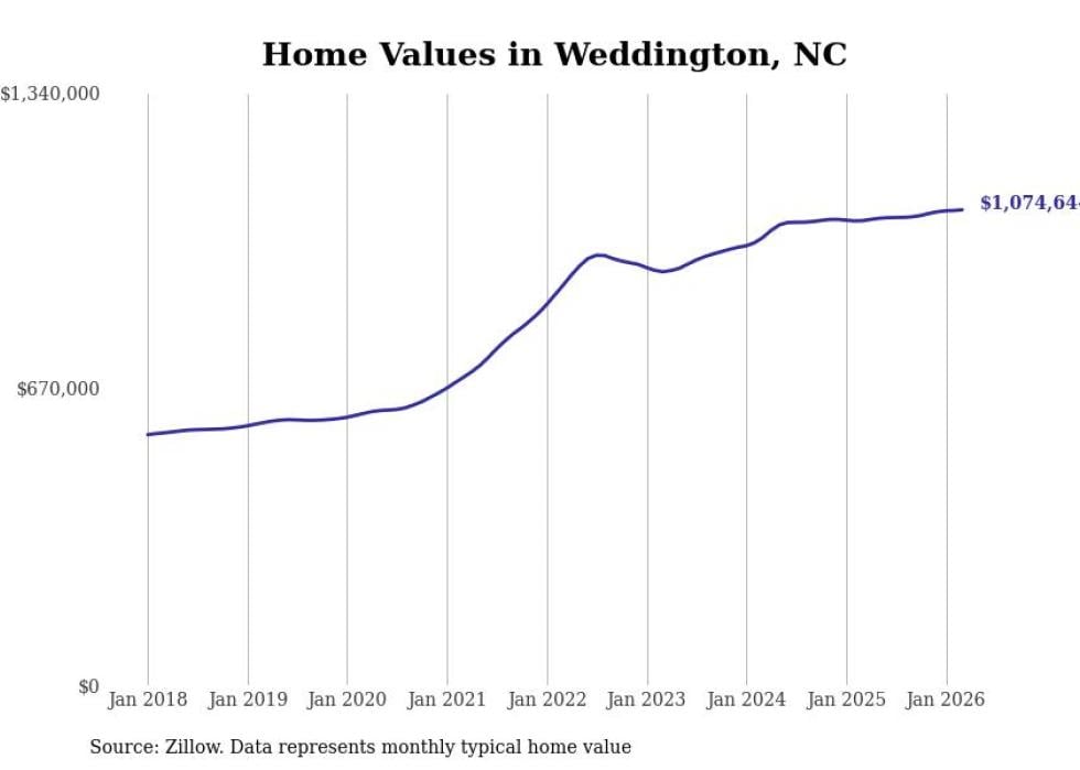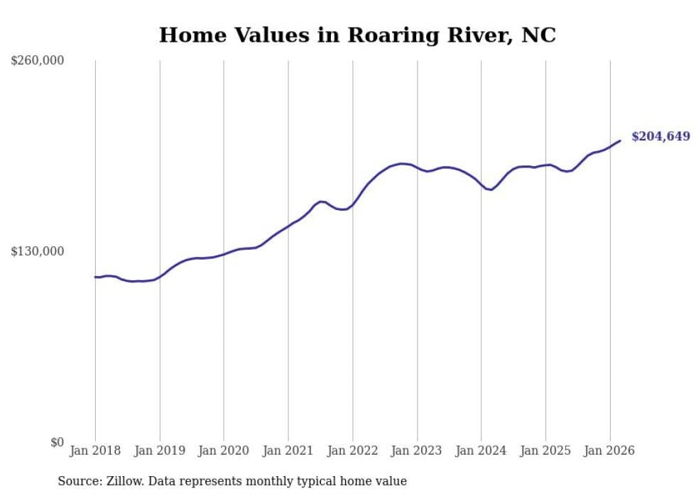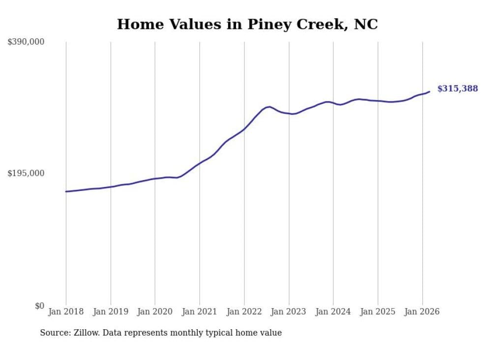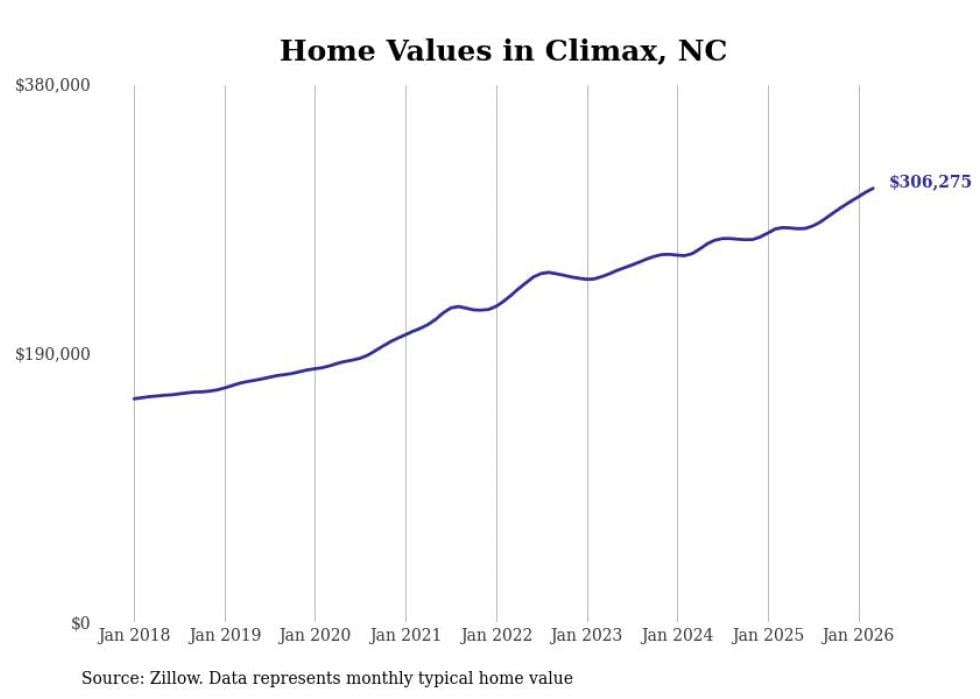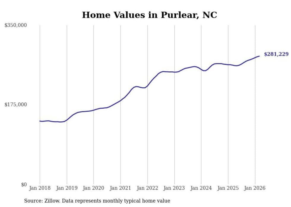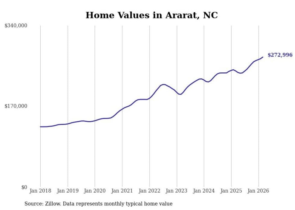 compiled a list of cities with the fastest-growing home prices in North Carolina using data from . Cities are ranked by the dollar change in the Zillow Home Values Index for all homes from the 12 months ending March 2026. The charts in this story were created automatically using . Data was available for 50 cities and towns in North Carolina.