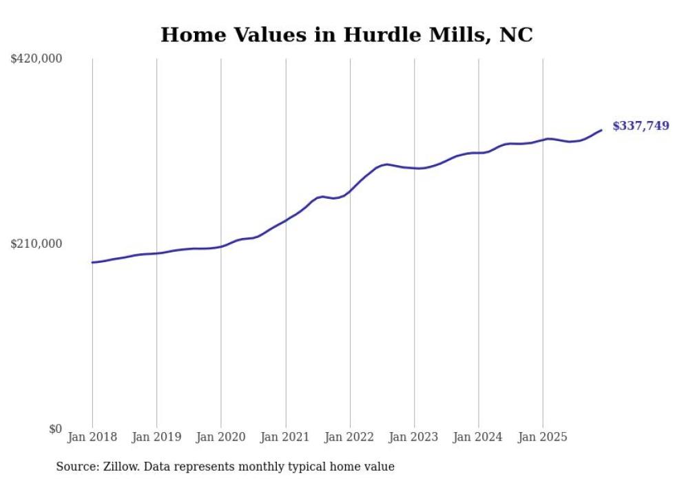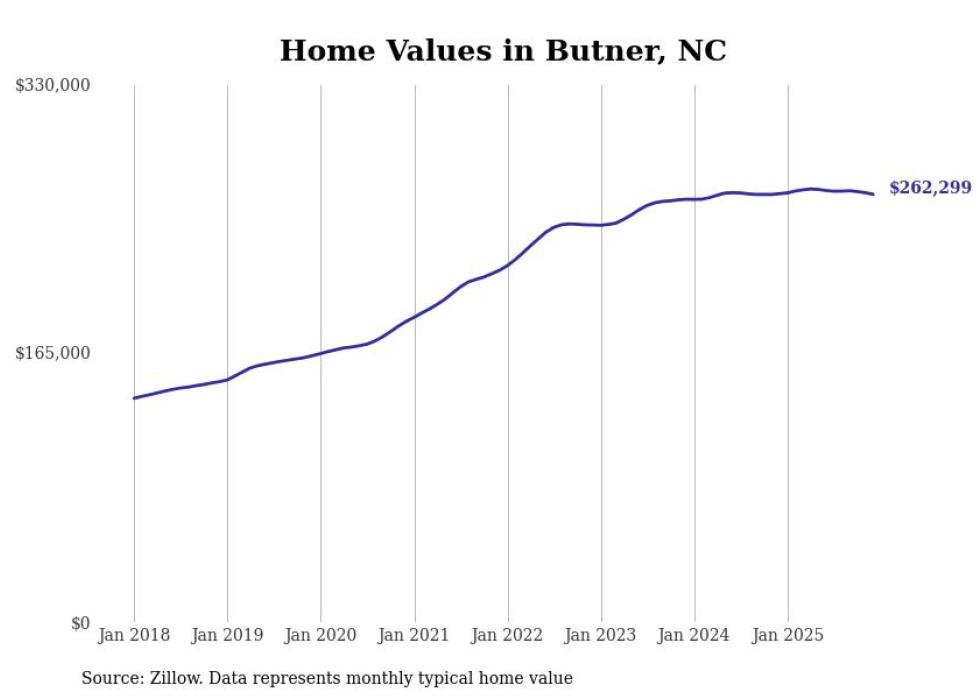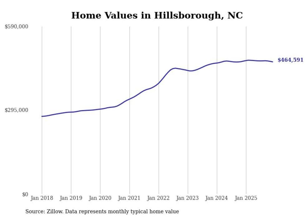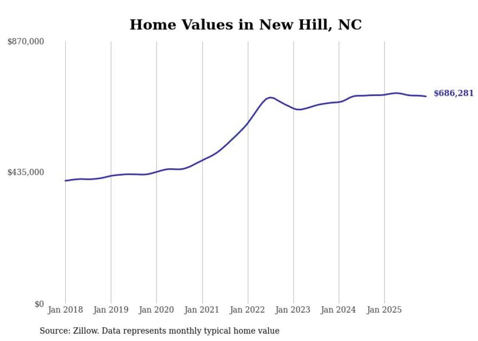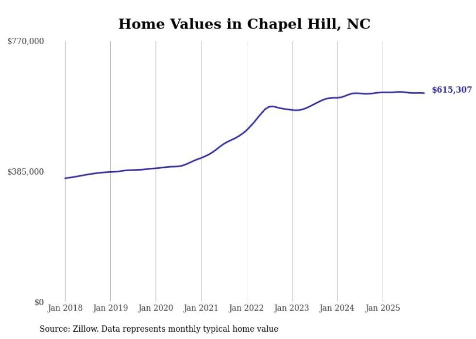 compiled a list of cities with the most expensive homes in the Durham-Chapel Hill, NC metro area using data from . Charts show the monthly typical home value since January 2018.