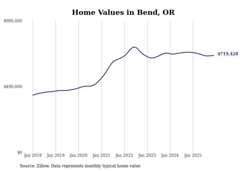 compiled a list of cities with the most expensive homes in the Bend, OR metro area using data from . Charts show the monthly typical home value since January 2018.