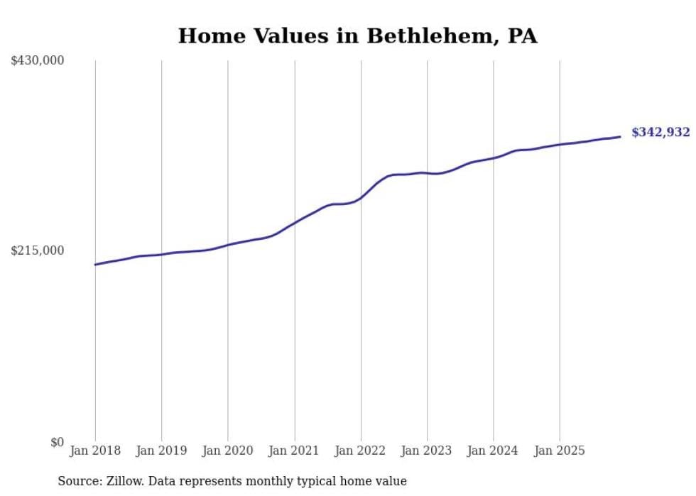 compiled a list of cities with the most expensive homes in the Allentown metro area using data from . Charts show the monthly typical home value since January 2018. Data was available for 42 cities and towns.