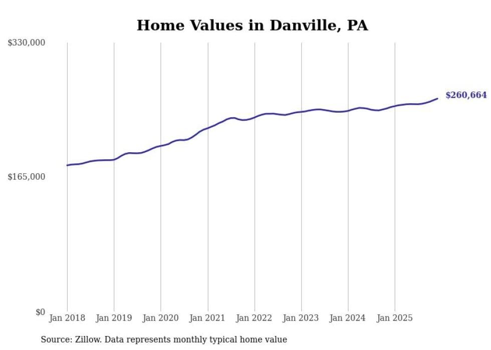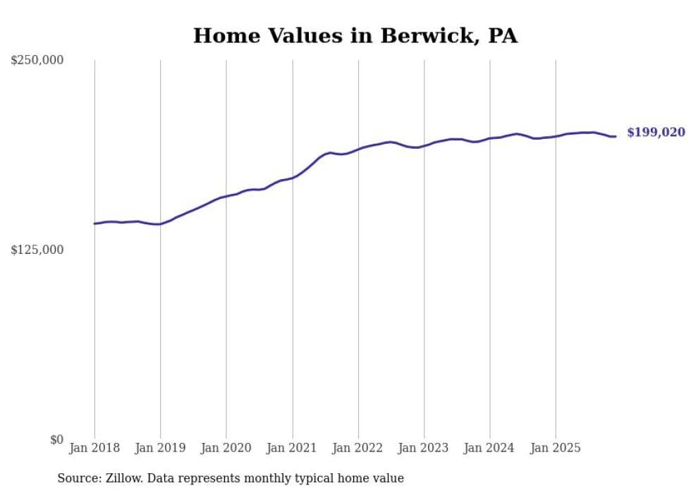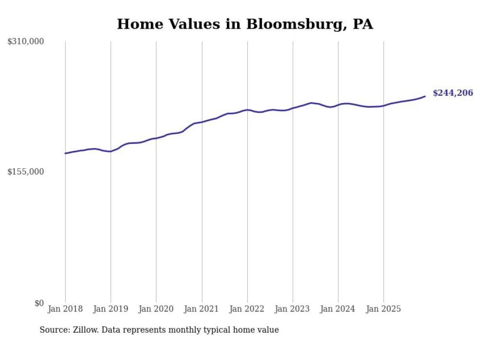 compiled a list of cities with the most expensive homes in the Bloomsburg metro area using data from . Charts show the monthly typical home value since January 2018. All 5 cities and towns with data available were included in the list.