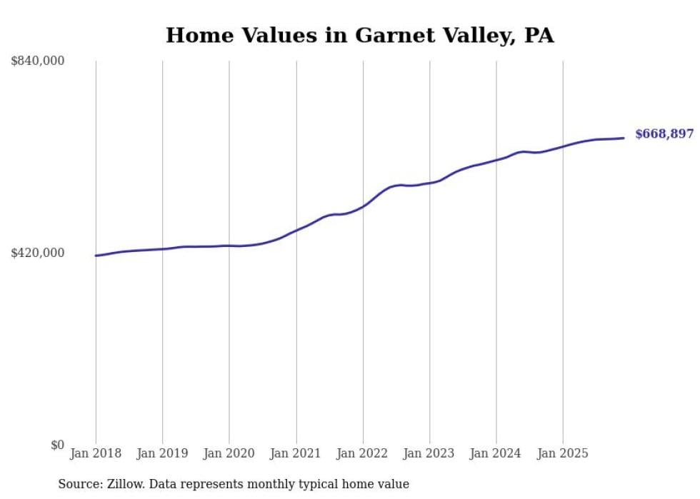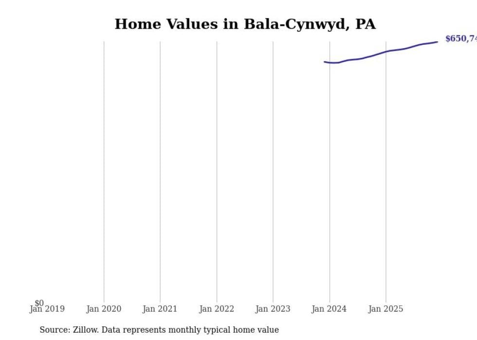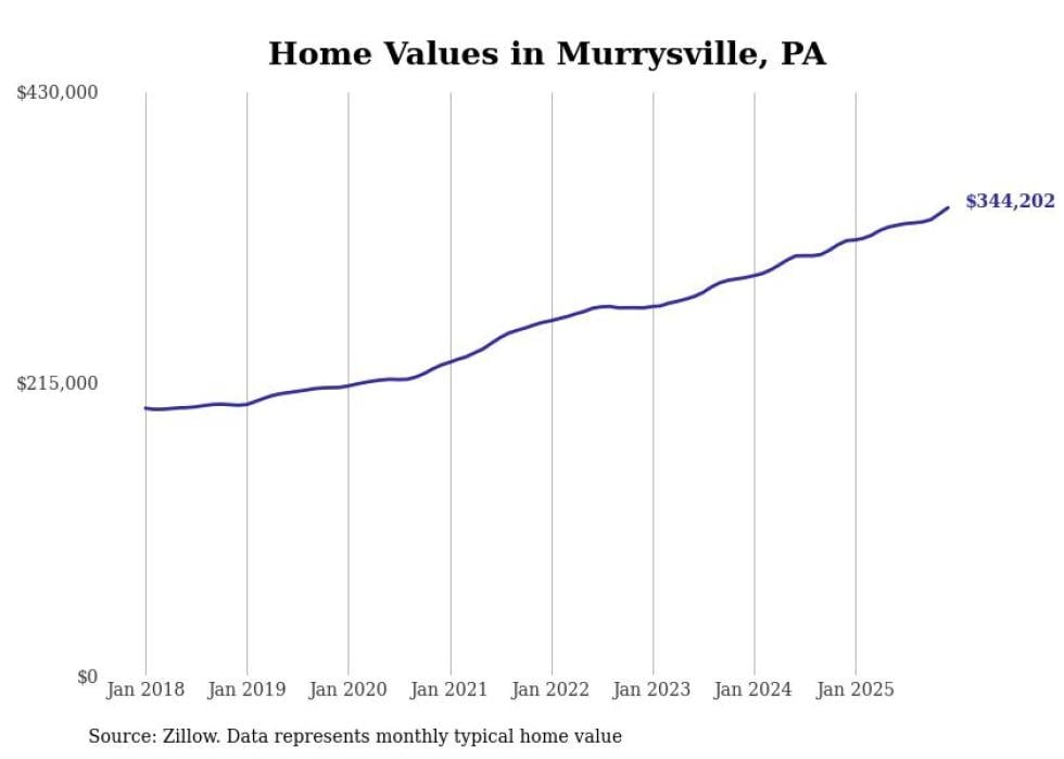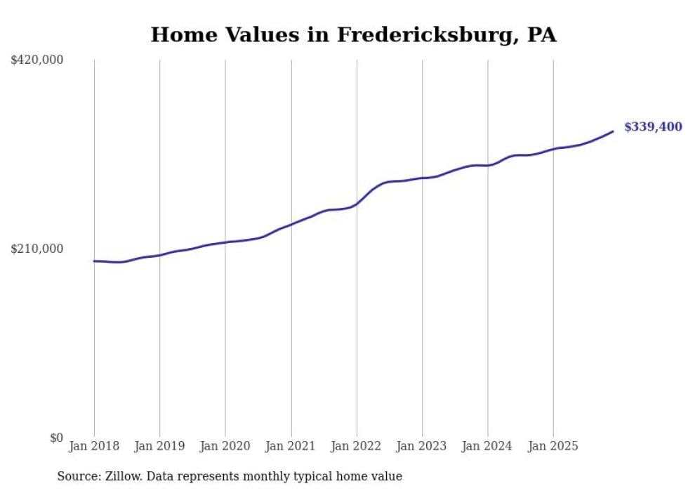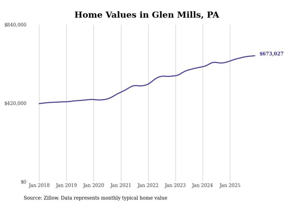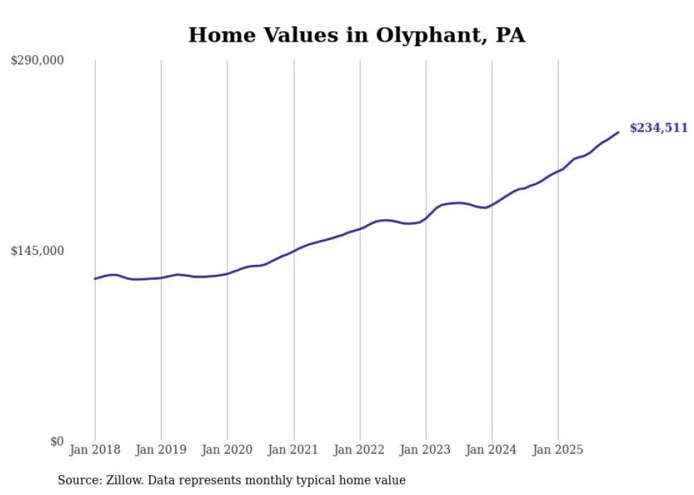 compiled a list of cities with the fastest-growing home prices in Pennsylvania using data from . Cities are ranked by the dollar change in the Zillow Home Values Index for all homes from the 12 months ending December 2025. The charts in this story were created automatically using . Data was available for 50 cities and towns in Pennsylvania.