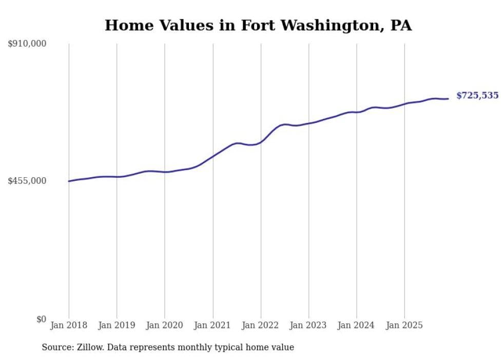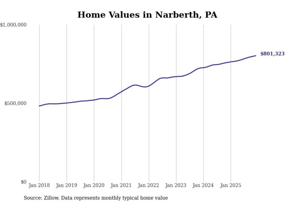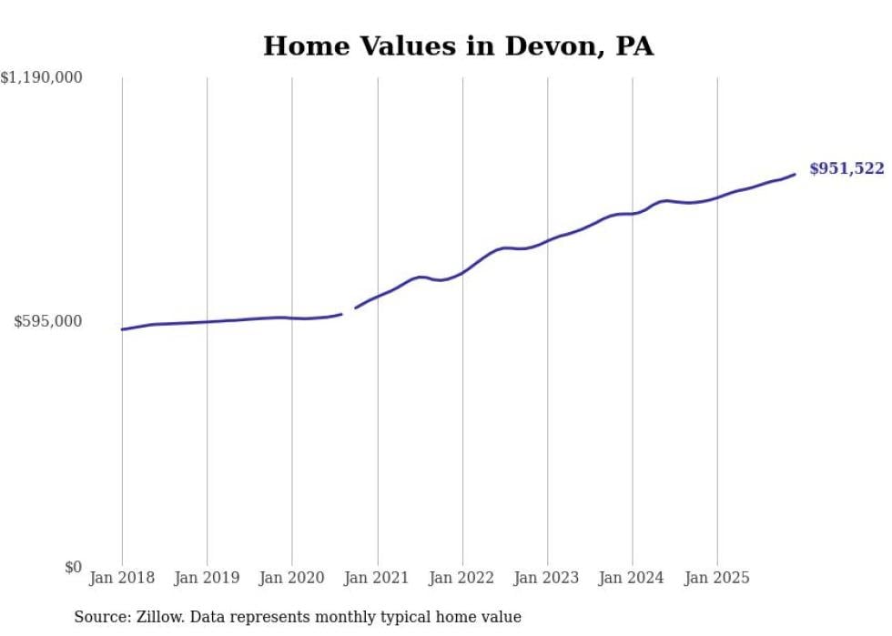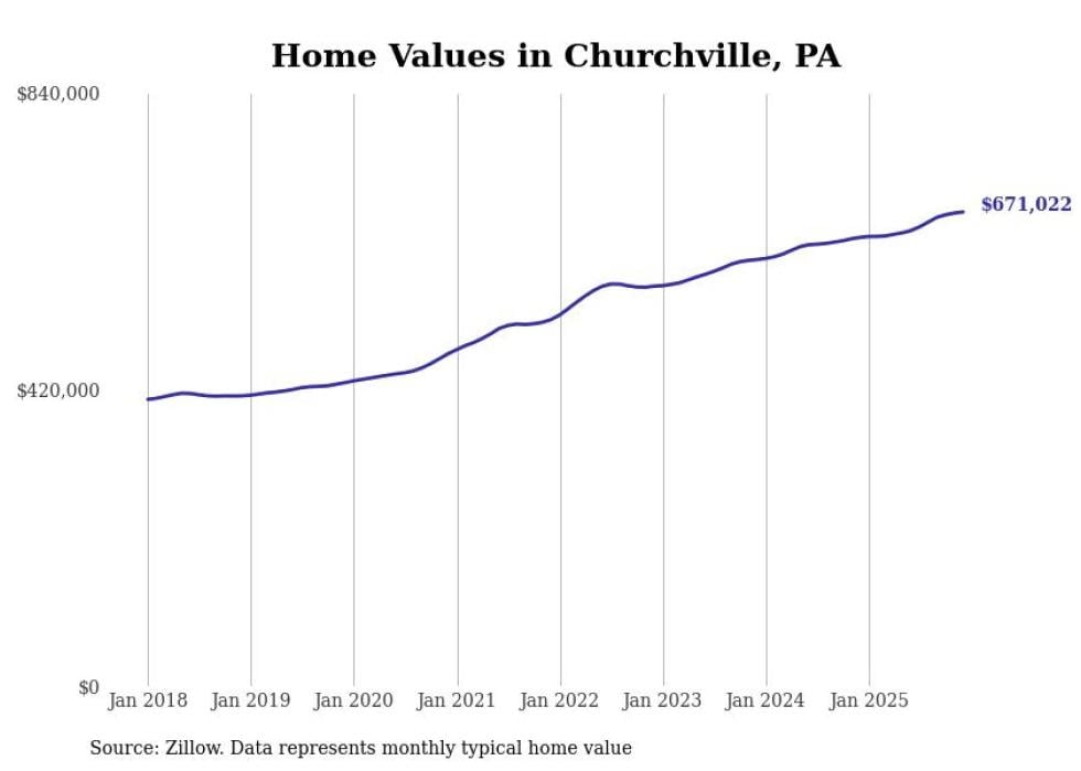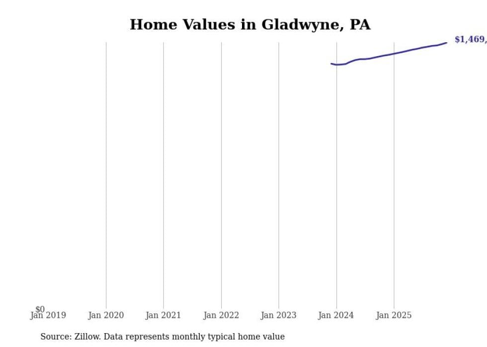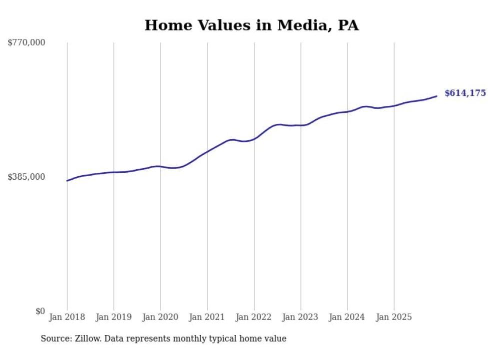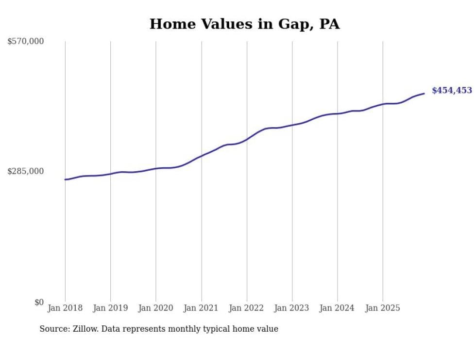 compiled a list of cities with the fastest-growing home prices in Pennsylvania using data from . Cities are ranked by the dollar change in the Zillow Home Values Index for all homes from the 12 months ending December 2025. The charts in this story were created automatically using . Data was available for 50 cities and towns in Pennsylvania.