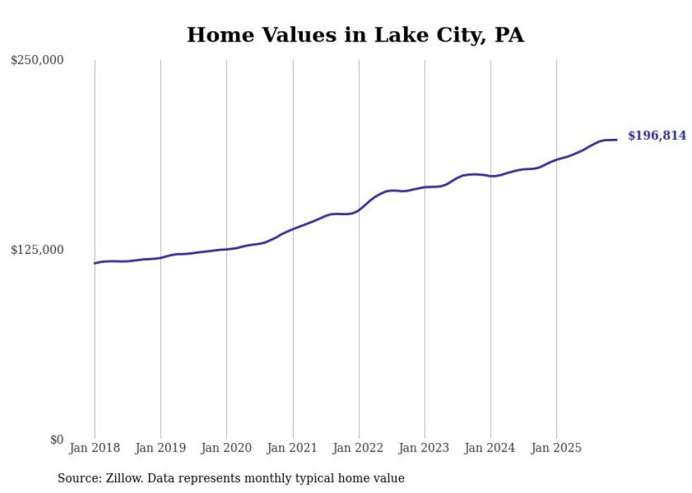 compiled a list of cities with the most expensive homes in the Erie, PA metro area using data from . Charts show the monthly typical home value since January 2018.