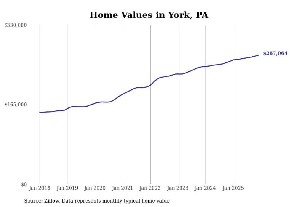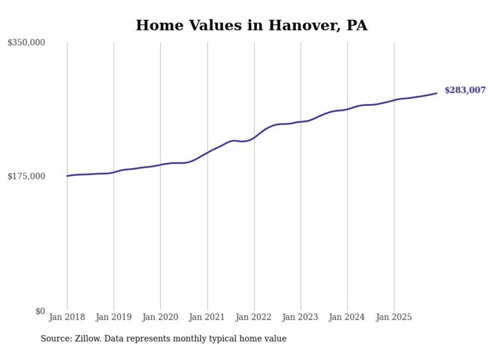 compiled a list of cities with the most expensive homes in the York-Hanover, PA metro area using data from . Charts show the monthly typical home value since January 2018.