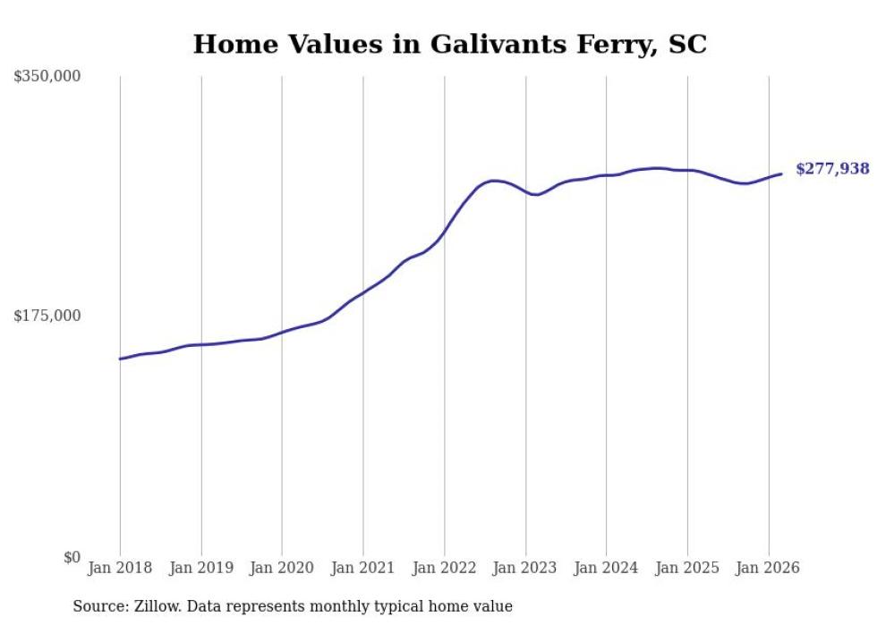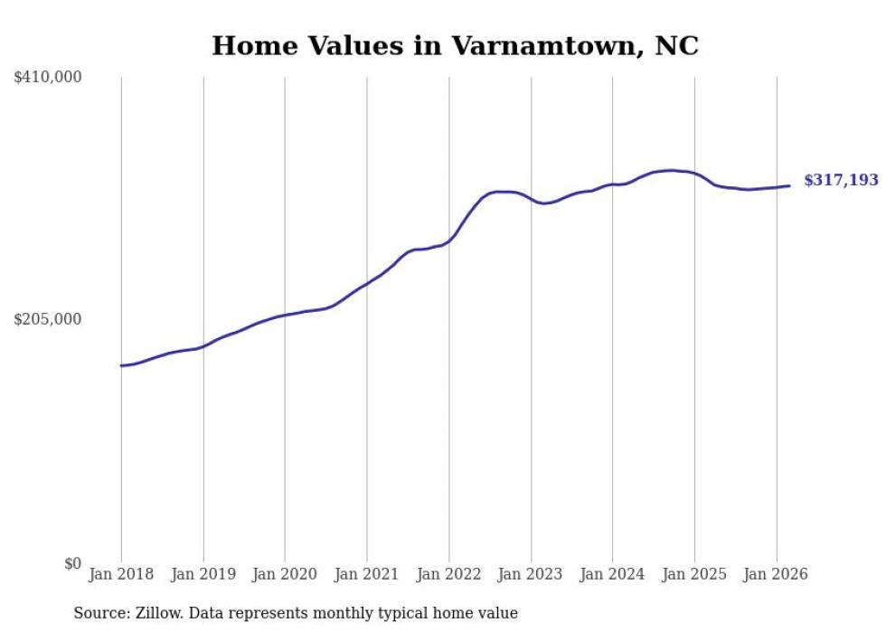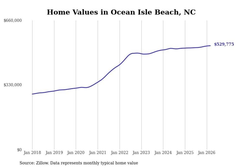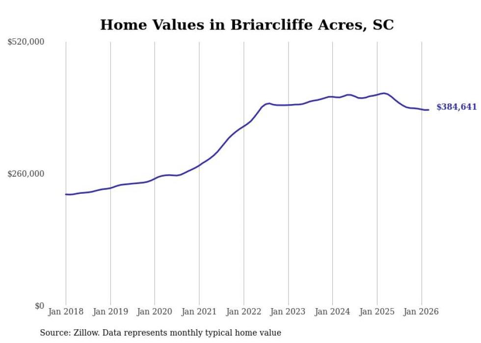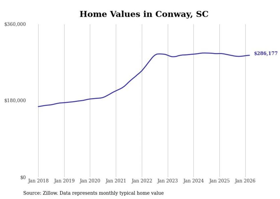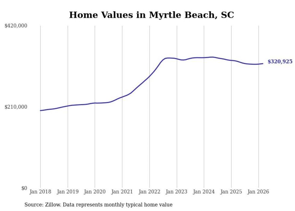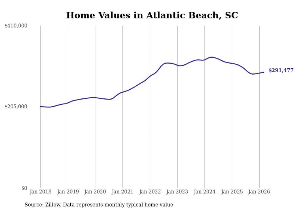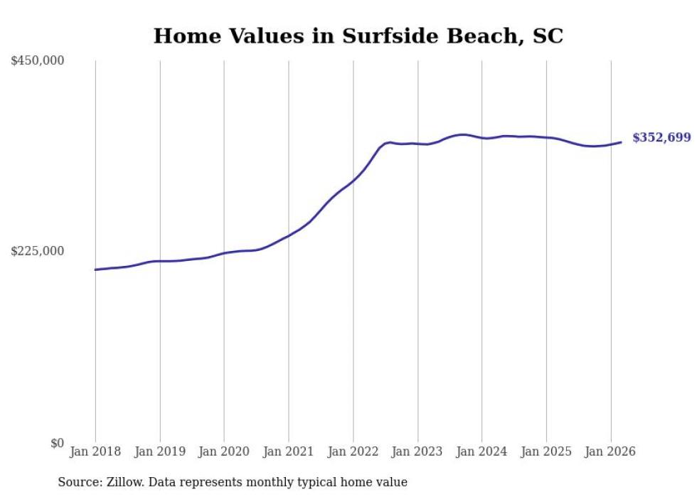 compiled a list of cities with the most expensive homes in the Myrtle Beach metro area using data from . Charts show the monthly typical home value since January 2018. Data was available for 31 cities and towns.