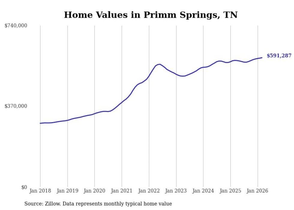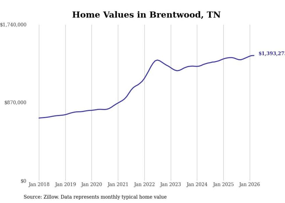 compiled a list of cities with the most expensive homes in the Nashville metro area using data from . Charts show the monthly typical home value since January 2018. Data was available for 75 cities and towns.